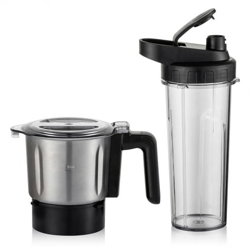 Блендер BioChef Galaxy Pro включает в себя стеклянный кувшин объемом 1,75 мл, удобный переносной контейнер на 900 мл и измельчитель из нержавеющей стали.