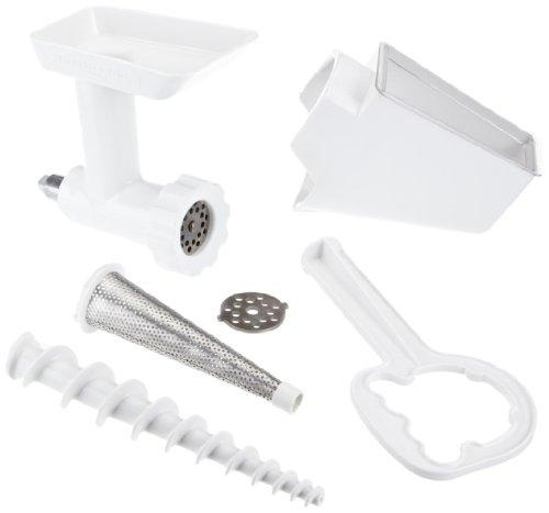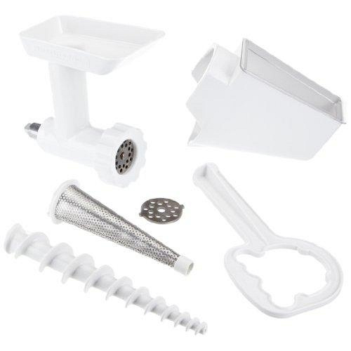З усіх додаткових насадок для планетарного міксера KitchenAid м'ясорубка є найбільш багатофункціональної з усіх. Вона може бути доповнена пристроями для наповнення ковбаси фаршем і додатковим широким піддоном для продуктів, що йдуть на переробку. У комплект до KitchenAid 5 FVSFGA насадці - м'ясорубці входить ще один багатофункціональний пристрій. Це насадка - для протирання пюре, вона працює на основі м'ясорубки. З її допомогою ви легко приготуєте всілякі пюре і соусів, різноманітні муси, фруктовий джем і багато інших речей. Насадка справляється з вареними твердими фруктами і овочами, здатна подрібнювати так само відварне м'ясо. Вона дуже затребувана в приготуванні дитячого харчування, що потребує однорідної і ніжної консистенції: пюре, соуси, супи.
