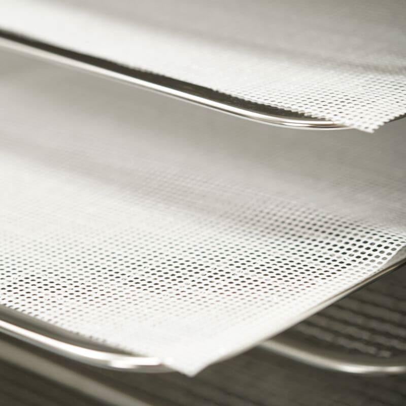 Коврик сетчатый силиконовый Tekhniko MSS-440 Технические характеристики Модель: MSS-440 Тип: сетчатый силиконовый коврик для дегидратора Размер: 28×30 см Диаметр отверстий: 1 мм Материал: пищевой силикон Тип конструкции: многоразовый Можно мыть: да Антиприлипание: есть Совместимость: лотки размером 30×28 см (дегидраторы Tekhniko с лотками 30×28) Преимущества • Идеальный размер 28×30 см для дегидраторов Tekhniko с лотками 30×28 см • Отверстия 1 мм обеспечивают равномерную циркуляцию воздуха • Пищевой силикон — безопасный, термостойкий, не впитывает запахи • Гибкий и износостойкий — легко снимается и моется • Отличная структура — предотвращает прилипание даже мелких продуктов • Подходит для ягод, зелени, трав, рыбы, мяса кусочками и нежных продуктов • Простое очищение — можно мыть под водой или в посудомоечной машине • Универсальный — подходит для дегидрации, выпечки, заморозки и приготовления пастилы Описание Сетчатый силиконовый коврик Tekhniko MSS-440 — удобный и практичный аксессуар для сушки мелких или нежных продуктов. Благодаря отверстиям диаметром 1 мм коврик обеспечивает хорошую циркуляцию воздуха и предотвращает падение маленьких кусочков через решётку лотка. Изготовленный из пищевого силикона, он устойчив к высоким температурам, не впитывает запахи и легко очищается. MSS-440 подходит для сушки зелени, ягод, трав, мяса кусочками, овощей, фруктовых ломтиков и натуральных домашних снеков. Гибкость и долговечность делают этот коврик универсальным и удобным в использовании.