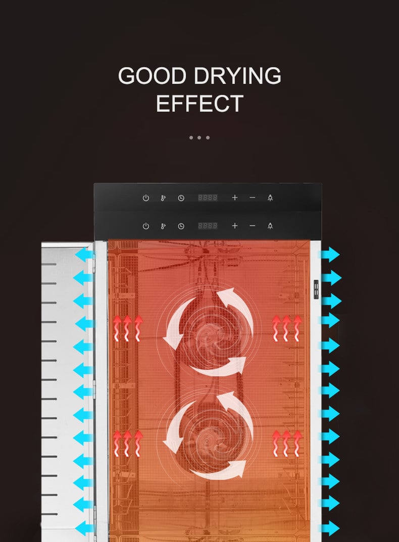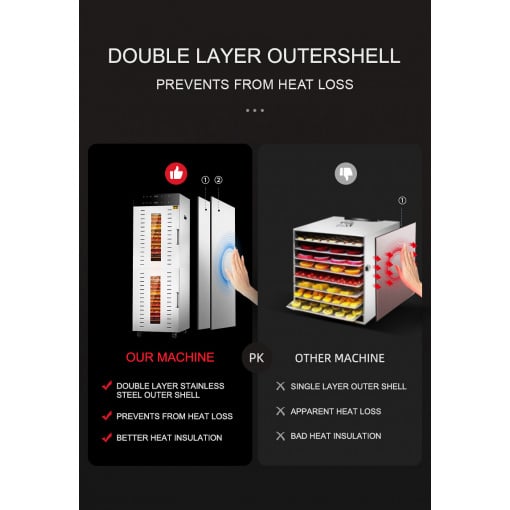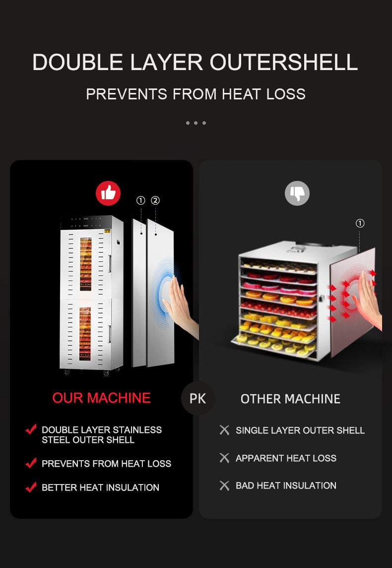 Дегідратор комерційний Tekhniko DH-32H-BK чорний (32 лотки) Комерційний дегідратор Tekhniko DH-32H-BK commercial (32 лотка) Модель: DH-32H-BK Колір: чорний Потужність: 3000 Вт (max) Номінальна потужність: 240 : 32 шт Розмір лотка: 40*38 см Висота між лотками: 35 мм Місткість сирих продуктів на 1 лотку: ~ 1,5 кг Загальна місткість сирих продуктів: ~ 48,0 кг Напруга: 220-240 В, 50 Гц Температура: 30 ~90°C (крок 5°C) Таймер, діапазон часу: 0-24 години (крок 30 хв) Рівень шуму: 50-55 дБ Розмір: Ш 46,5 * Г 57,0 * В 132,0 см (без коліс) Вага: 46,0 кг Габарити упаковки: - 52,5*62,5*137,5 см (внутрішня упаковка) - 53,5*66*147 см (зовнішня дерев'яна упаковка) Вага з упаковкою: - 48,0 кг (внутрішня упаковка) - 70,0 кг (зовнішня дерев'яна упаковка) Гарантія: 12 міс Особливості: 4 вентилятори - горизонтальна система сушіння 2 незалежних відсіку (2 вентилятори на кожен відсік) Світлодіодний дисплей Двошаровий корпус з нержавіючої сталі Внутрішнє світлодіодне підсвічування крихт і води Магнітні замки дверцята 4 транспортувальні колеса Лотки з нержавіючої сталі SUS304 Корпус з нержавіючої сталі SUS201 Алюмінієва ручка Властивості: 32 лотки великої ємності, вміщує до 48 кг свіжих продуктів 4 двигуна + 4 системи сушіння лопатевий вентиль рівномірне сушіння Розмір лотків становить 400 X 380 мм, а зазор (висота) між двома лотками становить 35 мм. Прозоре загартоване скло, зручне для спостереження за сушінням усередині. , закусок і т. д Точне цифрове управління, простота в експлуатації, низький рівень зносу деталей Корпус з нержавіючої сталі SUS201 товщиною 0,6-0,8 мм, лотки з нержавіючої сталі SUS304 Комплектація: Дегідратор Tekhniko DH-32-SS 32 лотки нержавіючої сталі Піддон для збору води та крихт 2 шт Книга рецептів (укр.мова) Інструкція (укр.мова) Гарантійний талон