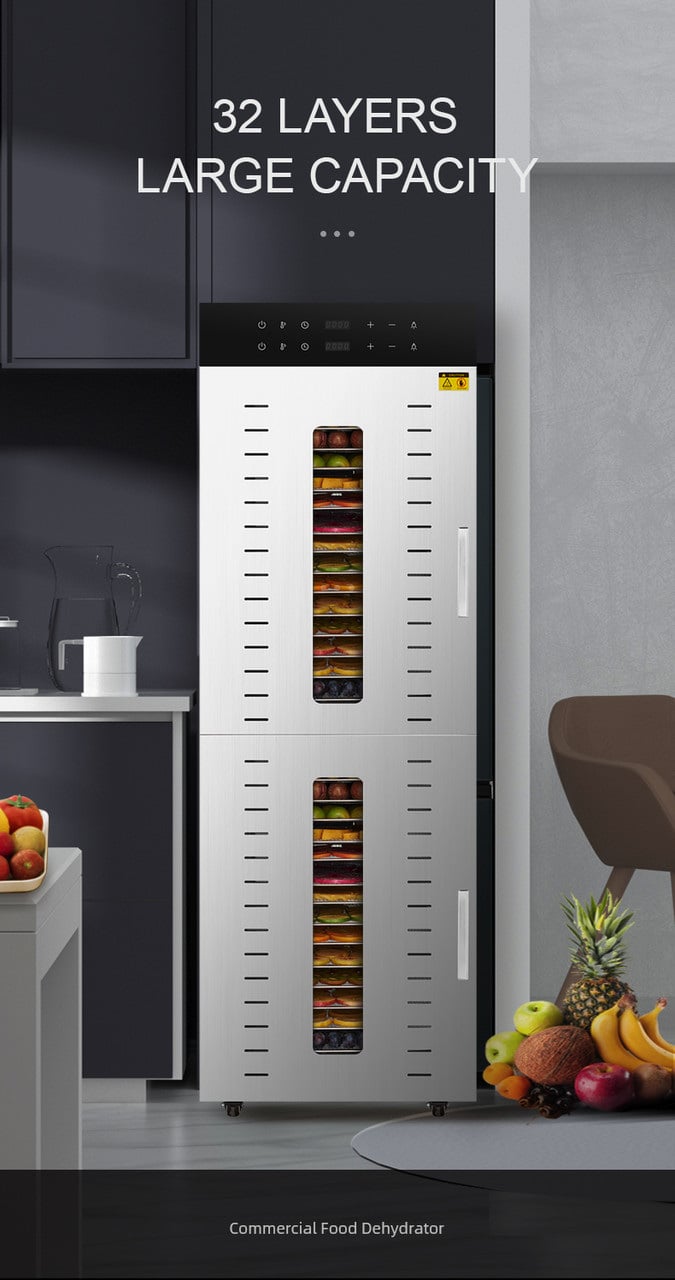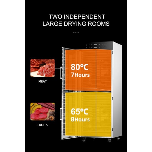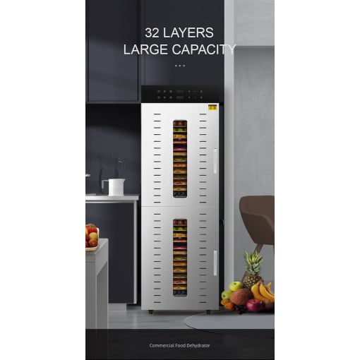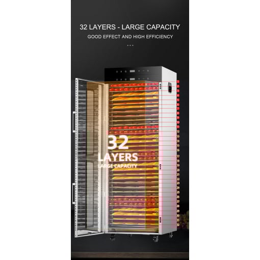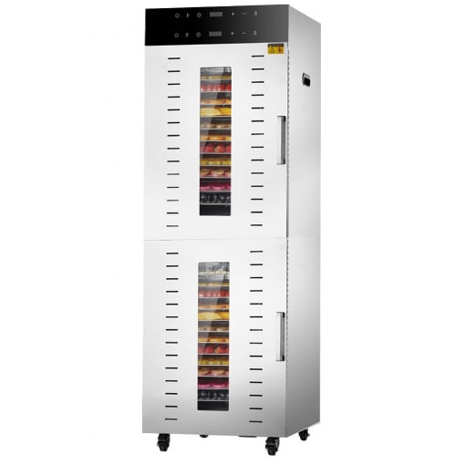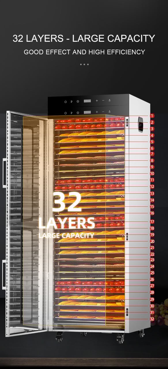 Дегідратор комерційний Tekhniko DH-32H-SS commercial (32 лотки) Комерційний дегідратор Tekhniko DH-32H-SS commercial (32 лотка) Модель: DH-32H-SS Колір: нержавіюча сталь Потужність: 3000 Вт (max) Номінальна потужність: 2 лотків: 32 шт Розмір лотка: 40*38 см Висота між лотками: 35 мм Місткість сирих продуктів на 1 лотку: ~ 1,5 кг Загальна місткість сирих продуктів: ~ 48,0 кг Напруга: 220-240 В, 50 Гц Температура: 30 ~ 90 ° C (крок 5 ° C) Таймер, діапазон часу: 0-24 години (крок 30 хв) Рівень шуму: 50-55 дБ Розмір: Ш 46,5 * Г 57,0 * В 132,0 см ( без коліс) Вага: 46,0 кг Габарити упаковки: - 52,5*62,5*137,5 см (внутрішня упаковка) - 53,5*66*147 см (зовнішня дерев'яна упаковка) Вага з упаковкою: - 48, 0 кг (внутрішня упаковка) - 70,0 кг (зовнішня дерев'яна упаковка) Гарантія: 12 міс Особливості: 4 вентилятори - горизонтальна система сушіння 2 незалежні відсіки (2 вентилятори на кожен відсік) Світлодіодний дисплей Двошаровий корпус з нержавіючої сталі Внутрішня світлодіодна підсвітка для крихт і води Магнітні замки дверцята 4 транспортувальні колеса Лотки з нержавіючої сталі SUS304 Корпус з нержавіючої сталі SUS201 Алюмінієва ручка Властивості: 32 лотки великої ємності, вміщує до 48 кг свіжих продуктів 4 двигуна + 4 системи сушіння лопатям Розмір лотків становить 400 X 380 мм, а зазор (висота) між двома лотками складає 35 мм. Прозоре загартоване скло, зручне для спостереження за сушінням всередині. бобів, закусок і т. д. Точне цифрове управління, простота в експлуатації, низький рівень зносу деталей Корпус з нержавіючої сталі SUS201 товщиною 0,6-0,8 мм, лотки з нержавіючої сталі SUS304 Комплектація: Дегідратор Tekhniko DH-32H-SS 32 лотка з нержавіючої сталі Піддон для збору води та крихт 2 шт Книга рецептів (укр.мова) Інструкція (укр.мова) Гарантійний талон