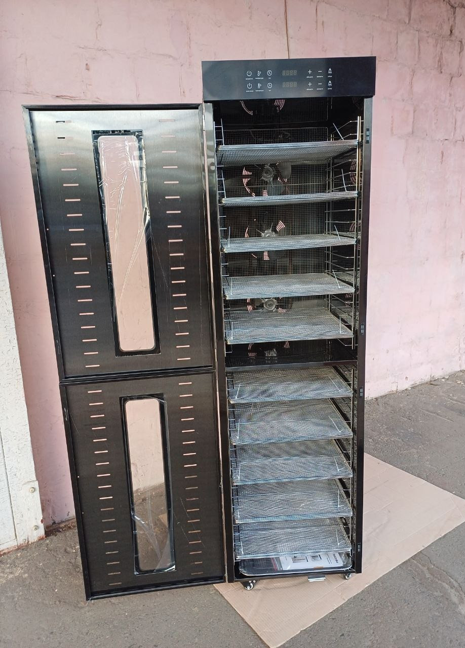 Дегідратор комерційний Tekhniko DH-40H-BK commercial (40 лотков) Комерційний дегідатор Tekhniko DH-40H-BK commercial (40 лотків) Модель: DH-40H-BK Колір: чорний Потужність: 4000 Вт (max) Номінальна потужність: 3200 Вт Кількість лотків: 40 шт Розмір лотка: 40*38 см Висота між лотками: 35 мм Місткість сирих продуктів на 1 лотку: ~ 1,5 кг Загальна місткість сирих продуктів: ~ 60 кг Напруга: 220-240 В, 50 Гц Температура: 30~90°C (крок 5°C) Таймер, діапазон часу: 0-24 години (крок 30 хв) Рівень шуму: 50-55 дБ Розмір: Ш 46,5 * Г 57,0 * В 161,6 см (без коліс) Вага: 54,0 кг Габарити упаковки: - 52,5*62,5*167,0 см (внутрішнє упакування) - 53,5*66*178,6 см (зовнішня дерев'яна упаковка) Вага з упаковкою: - 57,0 кг (внутрішнє упакування) - 84,0 кг (зовнішня дерев'яна упаковка) Гарантія: 24 міс Особливості: 6 вентиляторів - горизонтальна система сушки 2 незалежних відсіка (3 вентилятора на кожен відсік) Світлодіодний дисплей Двухшаровий корпус із нержавіючої сталі Внутрішня світлодіодна підсвітка Оцинкований піддон для крохт і води - 2 шт Магнітні замки дверцят 4 транспортувальні колеса Лотки з нержавіючої сталі SUS304 Корпус із нержавіючої сталі SUS201 Алюмінієва ручка Властивості: 40 лотків великої ємності, вміщують до 60 кг свіжих продуктів 6 двигунів + 6 системи сушки лопастним вентилятором - кращий ефект і більш висока ефективність Горизонтальная равномерная сушка Розмір лотків становить 400 X 380 мм, а зазор (висота) між двома лотками становить 35 мм. Прозоре закаленное скло, зручно для спостереження за сушкою всередині Можливість сушити всі види фруктів, овочів, м'яса, риби, морепродуктів, злаків, трав, бобів, закусок та ін. д Точне цифрове управління, простота в експлуатації, низький рівень розміру деталей Корпус з нержавіючої сталі SUS201 товщиною 0,6-0,8 мм, лотки з нержавіючої сталі SUS304 Комплектація: Дегідратор Техніко DH-40H-BK 40 лотка із нержавеючої сталі 2 піддона для збору води і крохт Книга рецептів (укр.язык) Інструкція (укр.язык) Гарантійний талон