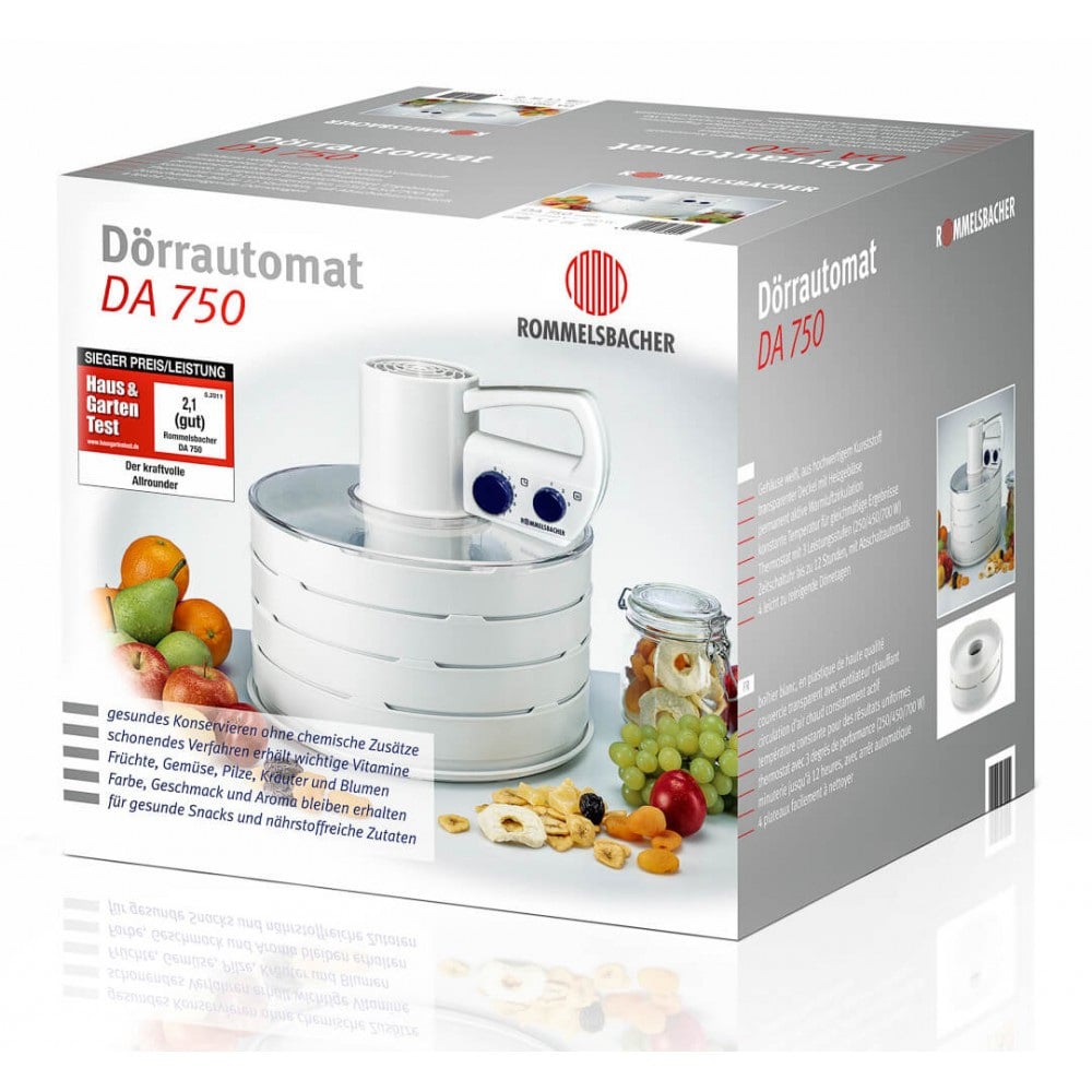 Дегідратор Rommelsbacher DA 750 Колір білий Потужність 230 В 700 Вт Вага предмета 2,67 кг Розміри 35,50 х 34,50 х 33,50 см 4 лотки для сушіння з високоякісного пластику, які легко чистити Виробник: Rommelsbacher Країна: Німеччина Гарантія: 24 міс Сушка - просте та дбайливе консервування гарячим повітрям корпус з першокласного пластику прозора кришка з вентилятором 4 лотки для сушіння з високоякісного пластику, які легко чистити 3 рівнях потужності 12-годинний таймер з автоматично можна використовувати з 8 лотками (продаються додатково) Фрукти, овочі, гриби та зелень сушаться рівномірно у потоці гарячого повітря без будь-яких консервантів. Зберігаються вітаміни, поживні та мінеральні речовини, концентруються смакові речовини. Ідеально підходить для приготування сушених інгредієнтів для круп, супів, соусів, чаю та закусок, а також для натуральних сухофруктів тощо. Ідеї з бабусиного будинку! За допомогою цього дегідратора можна легко консервувати фрукти, овочі, гриби або зелень оптимальним чином. Вентилятор забезпечує постійну активну циркуляцію гарячого повітря та постійну температуру для рівномірного результату. Таким чином, зберігаються смак, поживна цінність та мінерали – повністю без хімічних добавок та цукру. Люди, які їдять здорову їжу, і люди, які страждають на алергію, можуть самостійно готувати сухі інгредієнти для круп, супів і соусів. Любителі солодкого готують корисні закуски - ідеальні для перекусів у дорозі. 3 рівні потужності та таймер з автоматичним вимкненням забезпечують простоту використання. Чудовий пластиковий корпус простий у очищенні та робить практичний прилад ідеальним.