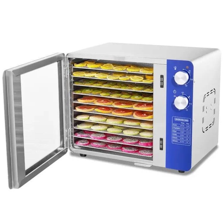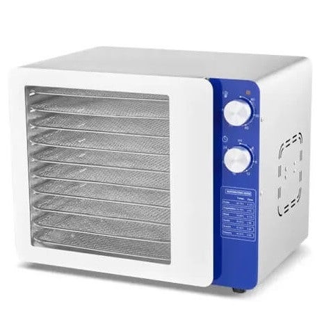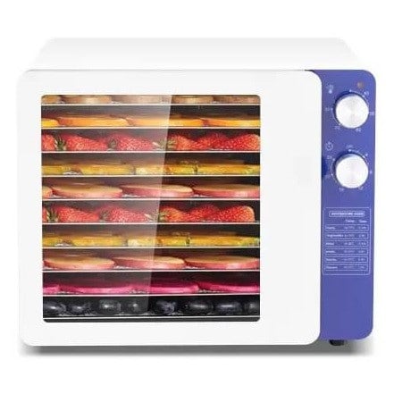 Дегидратор Tekhniko DH-10M-SS DH-10M-SS — бытовой дегидратор (10 лотков, механическое управление) Технические характеристики Модель: DH-10M-SS Цвет: нержавеющая сталь с синей панелью Максимальная мощность: 800 Вт Среднее энергопотребление: 640 Вт/ч Количество лотков: 10 шт Размер лотка: 30×28 см Расстояние между лотками: 30 мм Вместимость на лоток: около 0,5 кг Общая вместимость: около 5,0 кг Напряжение: 230 В Температурный диапазон: 30–75°C Таймер: 0–24 часа Тип управления: механическое (М-серия) Особенность: автоматическое восстановление работы после отключения питания Тип сушки: горизонтальная циркуляция воздуха Уровень шума: тихая работа (45–50 дБ) Корпус: нержавеющая сталь SUS201 с синей декоративной панелью Размеры устройства: 44×38×37,5 см Размеры упаковки: 49,5×39,5×49,3 см Вес нетто: 7,7 кг Вес брутто: 9,0 кг Гарантия: 24 месяца (на нагревательный элемент — 3 года) Преимущества • Механическое управление — простое и надёжное, без электроники. • Автоматическое продолжение работы после отключения электроэнергии. • Горизонтальная циркуляция обеспечивает одинаковую температуру на всех 10 уровнях. • Диапазон 30–75°C подходит для фруктов, овощей, ягод, мяса, зелени, грибов и пастилы. • Вместимость до 5 кг продуктов — удобно для больших домашних партий. • Лотки из нержавеющей стали SUS304 — долговечные, безопасные, легко моются. • Корпус из нержавеющей стали с синей панелью — прочный и стильный. • Прозрачная дверца для контроля процесса. • Тихая работа — комфортно даже ночью. • Поддон для сбора крошек — поддержание чистоты. • Энергоэффективная работа при средней нагрузке. Описание Tekhniko DH-10M-SS — это вместительный бытовой дегидратор с механическим управлением и 10 металлическими лотками. Горизонтальная циркуляция воздуха обеспечивает равномерную сушку без перестановки лотков. Температурный диапазон 30–75°C универсален для любых продуктов: фруктов, овощей, ягод, зелени, мяса, грибов и приготовления полезных домашних снеков. Отдельное преимущество — автоматическое восстановление работы после отключения питания, что важно при длительных циклах. Корпус из нержавеющей стали и тихая работа делают модель удобной для ежедневного использования. DH-10M-SS — надёжный выбор для дома и небольшого производства. Комплектация Дегидратор Tekhniko DH-10M-SS Лотки из нержавеющей стали — 10 шт Коврик для пастилы Tekhniko ChefMat CM-350 — 2 шт Сетчатый силиконовый коврик Tekhniko MSS-440 — 2 шт Силиконовая прихватка Tekhniko HotHand HH-200 — 2 шт Поддон для сбора крошек Инструкция Гарантийный талон