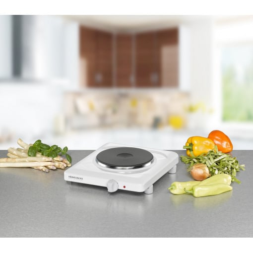 Електроплита Rommelsbacher THL 1597 Колір продукту білий Матеріал корпусу нержавіюча сталь Вихідна потужність 230 В 1500 Вт Вага предмету 3,08 кг Розміри (Ш/Г/В) 29,00 х 35,00 х 7,00 см зони приготування їжі 1 Ø 180 мм, 1500 Вт Особливі можливості корпус з вогнетривкою емаллю особливо міцний і простий у догляді Виробник: Rommelsbacher Країна виробник: Німеччина Гарантія: 24 міс Привабливі конфорки з високою споживчою цінністю, зроблені в Німеччині. Корпус з вогнетривкої емалі білого кольору, міцний і легко чистий стрункий дизайн з м'якими лініями міцна чавунна нагрівальна плита оптимальне розподілення тепла безступінчасте регулювання температури, автоматичний наддув Індикаторна лампа, захист від перегріву Heizplatte: Ø 180 мм, кухні, ідеально підходить для офісу чи дачі, для льоху чи альтанки. Ця одинарна варильна панель відрізняється дуже привабливим дизайном, функціональністю та зручністю використання. Міцна оригінальна чавунна нагрівальна пластина діаметром 180 мм ідеально підходить для великих каструль та сковорід усіх видів та забезпечує оптимальний розподіл тепла; завдяки функції автоматичного форсування пластина нагрівається на повну потужність кожному рівні. Корпус покритий високоякісною вогнетривкою емаллю і тому залишається білим навіть після тривалого використання. Ця варильна панель — правильний вибір для економних та вимогливих клієнтів.