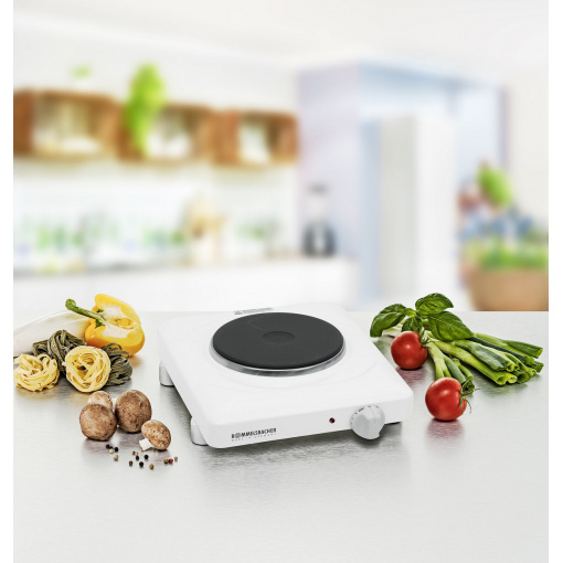 Електроплита Rommelsbacher THS 815 з таймером Колір продукту білий Матеріал корпусу вогнетривка емаль Вихідна потужність 230 В 800 Вт Вага предмета 2,42 кг Габаритні розміри 25,00 х 31,50 х 8,50 см Тип варильної поверхні Нагрівальна плита з чавуну Особливі можливості запатентована система термостата Група товарів Конфорки з чавунною нагрівальною пластиною Виробник: Rommelsbacher Країна виробник: Німеччина Гарантія: 24 міс якість вироблена в Німеччині модель 815-я має таймер, регулювання потужності немає таймер на 15 хвилин, автовимкнення плита потужністю 800 Вт електроплита безпечна у використанні дизайн Softline надійна вогнетривка емаль нагрівальна частина - якісний чавунний млинець діаметром 14,5см вбудований захист від перегріву світловий індикатор роботи Електроплита настільна Rommelsbacher модель THS 815 має таймер замість регулювання потужності та представлена в дизайні Softline. Корпус виготовлений з нержавіючої сталі і покритий спеціальною жароміцною емаллю, яка прослужить довгі роки. Нагрівальний млинець плити виготовлений з якісного чавуну і призначений для роботи з усіма видами посуду. Унікальність цієї плити є наявність таймера, можна виставити від 1 до 15 хвилин, який контролює роботу нагрівального елемента. Після закінчення заданого часу нагрівання вимикається автоматично. Ця особлива плита забезпечує надійність та безпеку. Електроплиту Rommelsbacher THS 815 з таймером можна використовувати на кухні в будинку, в гуртожитку, на дачі та завдяки своїм розмірам можна брати в подорож.