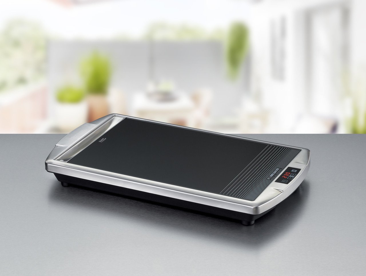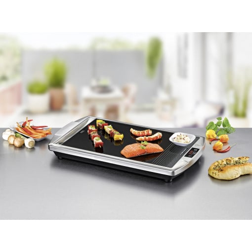 Гриль склокерамічний SCHOTT CERAN® Rommelsbacher CG 2308/TC Колір продукту Нержавіюча сталь/чорний Матеріал корпусу нержавіюча сталь Потужність 220 В 2000 Вт Вага предмета 4,83 кг Розміри (Ш/Д/В) 55,00 x 30,50 cm Поверхня гриля 36 х 27 см Матеріал гриля SCHOTT CERAN® (склокераміка) Особливості Диапазон температур до 280°, ідеально підходить для обсмажування Виробник: Rommelsbacher Країна виробництва: Німеччина Гарантія: 24 міс Інноваційна елегантність "Зроблено в Німеччині" - корпус з матової нержавіючої сталі дизайн софтлайн поверхня гриля зі склокераміки CERAN® потужний нагрівач гриля забезпечить швидке нагрівання та оптимально розподілить тепло діапазон температури до 280°C регулятор температури 80°C - 280°C з кроком 10 дисплей з підсвічуванням звуковий сигнал управління сенсорне електронне Спеціальний знімний канал для збору жиру, підставка для нахилу грилю Індикатор залишкового тепла, захист від перегріву Площа гриля: 36 х 27 см У комплекті: скребок, що чистить, інструкція ресторану, будинку, квартири, заміського будинку він ідеальний і підходить до будь-якого столу. Якщо ви любитель посмажити м'ясо чи ковбаски Гриль склокерамічний SCHOTT CERAN® Rommelsbacher CG 2308/TC здивує та задовольнить ваші смаки на 100%. За грилем дуже просто доглядати, легко чистити і мити, оскільки він виготовлений із високоякісної сталі та скла. Модель CG 2308/TC регулюється за допомогою сенсорних датчиків, що дозволяє забезпечити нагрівання рівномірно та швидко. Електронний контроль температури є особливо важливим для приготування різних страв, він чітко контролює задані параметри до 280 °C. Це робить смачнішими стейки, ковбаски, рибу і навіть млинці. Гриль має спеціальний нахил, який легко встановлюється при бажанні для стікання жиру. Німецькі розробники створили незвичайний прилад для незвичайного приготування на грилі.