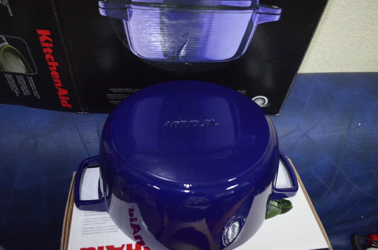 KitchenAid KCPI60CRFU Professional Cast Iron 6-Quart Casserole Cookware - Fiesta Blue Каструля з кришкою-гриль, чавунна KitchenAid KCPI40CR Cast Iron, об'єм 3,8 л, діаметр 24 см, колір темно-синій Чавунний посуд KitchenAid Чавунний посуд KitchenAid зробить кожне ваше блюдо кулінарним шедевром! Чавунна каструля середнього розміру ідеально підходить для приготування страв, які вимагають повільного готування на невеликому вогні: тушкування або тушкування м'яса, овочів. Крім того, у каструлі можна готувати запіканки, пироги та навіть хліб. Особливості: - Внутрішнє емальоване покриття стійке до механічних пошкоджень, не вбирає запахи та смаки - Кришка має рифлену поверхню й може використовуватися як гриль - Ергономічні ручки - Підходить для зберігання страв у холодильнику та морозильній камері - Підходить для використання на всіх варильних поверхнях, зокрема індукційних - Можна розігрівати до 260 °C, використовуючи каструлю в духовій шафі