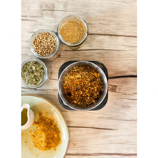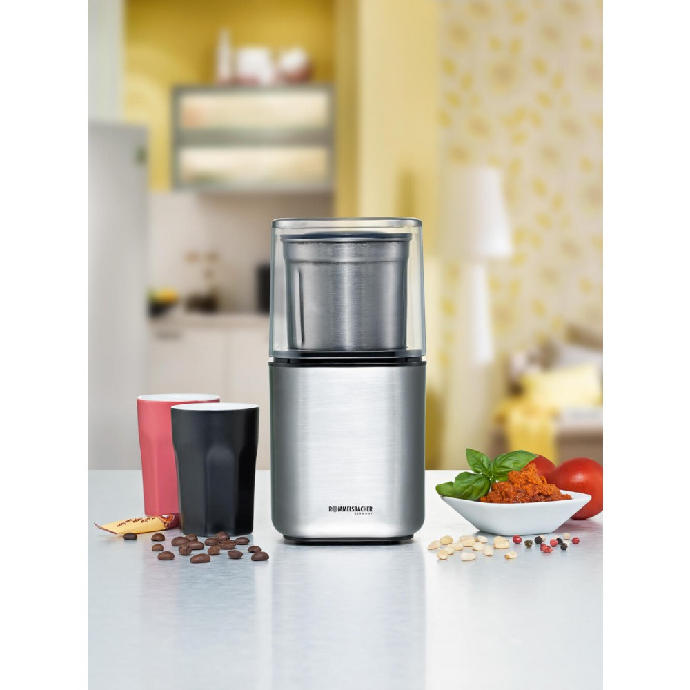 Елегантна кавомолка і подрібнювач для спецій від Rommelsbacher ідеально підходить для подрібнення зерен, цукру, спецій, зелені, горіхів, насіння і багато чого іншого. Два різних робочих контейнера дозволяють використовувати його по-різному: в чашці кавомолки проводиться мелений кавовий порошок, сушені спеції, такі як перець, коріандр, кмин і навіть цукор і сіль, подрібнюються в мить ока. Універсальна чашка ідеально підходить для подрібнення зелені або приготування невеликої порції свіжого песто. Обидва змінних контейнера виготовлені з міцної нержавіючої сталі, тому їх дуже легко чистити.