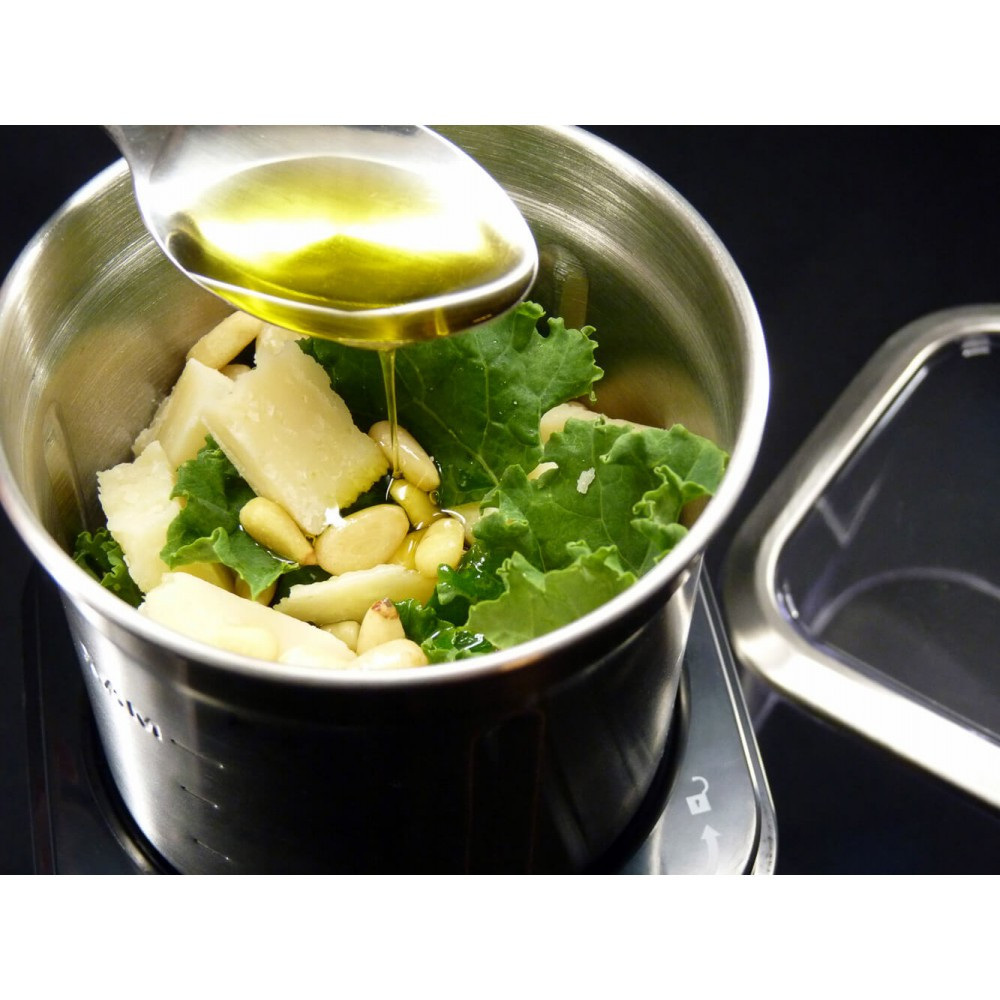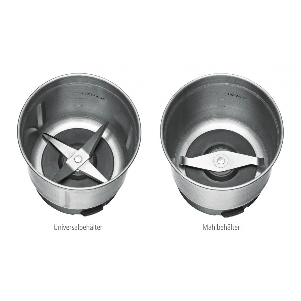 2 різних робочих контейнера дозволяють дуже різноманітно використовувати кавомолку: у чашці кавомолки проводиться мелений мелений кава, а сушені трави і спеції, такі як, наприклад, перець горошком, кмин, коріандр і навіть цукор, горіхи і зерна, подрібнюються в мить ока. Універсальна чашка ідеально підходить для подрібнення зелені або приготування невеликої порції свіжого песто. Обидві чашки виготовлені з нержавіючої сталі, не потребує особливого догляду, і забезпечені кришкою (що дуже часто необхідно для подальшого зберігання подрібнених продуктів).