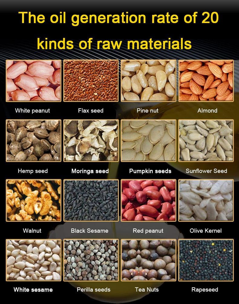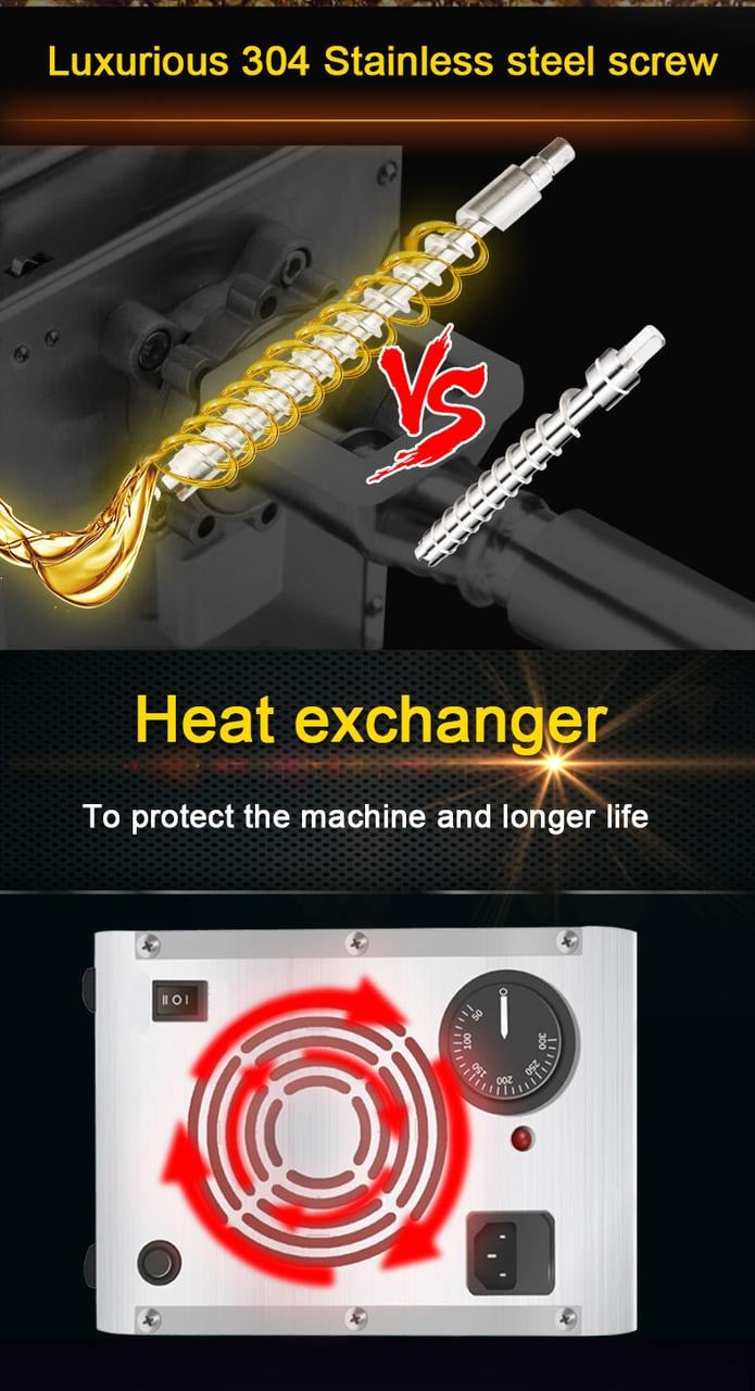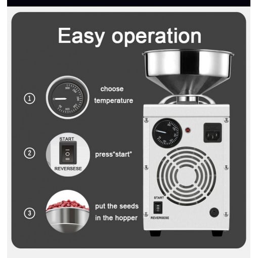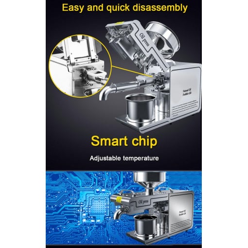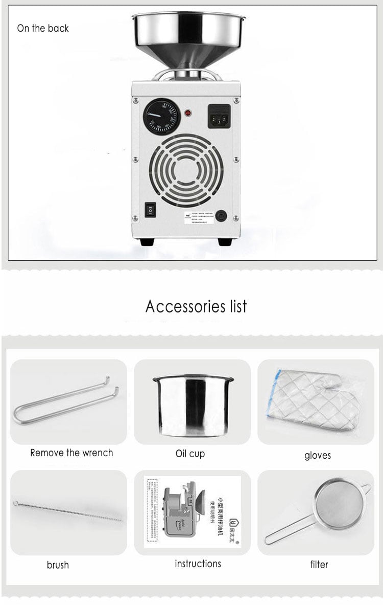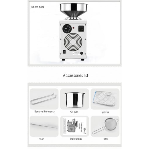 Маслопрес Tekhniko OP-18 Потужність: 880 Вт Продуктивність: 5-7 кг/год Термостат: 0-300°C Матеріал прес-шнека: нержавіюча сталь Тип: маслопрес холодного та гарячого віджиму Розмір: 46*15*26 см Розмір в упаковці: 55*20*23 см Вага: 10 кг Вага в упаковці: 13 кг Напруга 220В 50/60Гц Номінальна потужність 880 Вт Потужність двигуна 245 Вт Потужність нагрівача 635 Вт Довжина шнека 210 мм Матеріал шнека СС302 Розмір упаковки Цифровий контроль температури Гарантія: 1 рік Основні переваги: Новий дизайн, корпус повністю з нержавіючої сталі, мідний двигун, регульована температура, комерційний двигун змінного струму здатний працювати 24 години, харчовий матеріал. Сертифікати: 3C, CE, EU Тип олії: Олія насіння льону, соєва олія, олія насіння ріпаку, олія насіння чаю, олія базиліка, кунжутна, кедрова олія, соняшникова олія, мигдальна олія, олія волоського горіха, арахісова олія. Переваги: 1. Енергозбереження. Переробка 5 кг насіння = вартість 1.6kwh 2. Швидка робота: 500гр арахісу тільки за 5 хвилин 3. Легко чистити. Потрібно відкрити верхню кришку та зняти шнек для чищення, всі деталі мають антипригарну поверхню. 4. Простота експлуатації. Просто працювати за допомогою однієї кнопки – управління здійснюється однією кнопкою. 5. Тривалий термін служби. Може використовуватись протягом тривалого часу з повною потужністю. 6. Висока ефективність. Надійна конструкція та процес роботи, віджимання може бути порівнянний з великим масляним пресом. 7. Подвійний вентилятор охолодження для безперервного віджиму. 8. Великі вентиляційні отвори для запобігання перегріву компонентів та продовження терміну служби машини. 9. Подушки, що не ковзають, дозволяють ефективно знизити вібрацію машини під час роботи і зберегти стійкість. 10. Фільтр-сітка з нержавіючої сталі високої густини, що фільтрує домішки в олії. 11. Велика пропускна спроможність, 5-7 кг сировини на годину. Застосування: підходить для насіння соняшнику, ріпаку, олеандру, сої, насіння чаю, насіння перцю, кунжуту, арахісу і т. д. гірчиця, розторопша, мигдаль, ядро насіння аргани, насіння камелії, насіння каноли (ріпак), насіння рицини, насіння чіа, кокосова стружка або кокосова м'якоть,насіння бавовнику, зародки кукурудзи, насіння трави, насіння конопель, моринги, ядро насіння німа, перець (сухий), сосна ядро горіха, насіння шипшини, насіння сафлору, лимонник китайський та інше олійне насіння. Ефективність віджиму залежить від якості, сорту, вологості, температурного режиму віджиму, способу зберігання та місця вирощування насіння, що використовується. Ефективність віджиму олії з 1 кг. (середня): Арахіс 45% Кунжут білий 50% Кунжут чорний 50% Соняшник очищений 54% Горіх грецький 40% Льон "Кудряш" 45% Коноплі неочищені 30% Гірчиця чорна, біла, жовта 30% Рижий 32% Гарбуз очищений 40% Редька олійна 45% Коріандр 20%