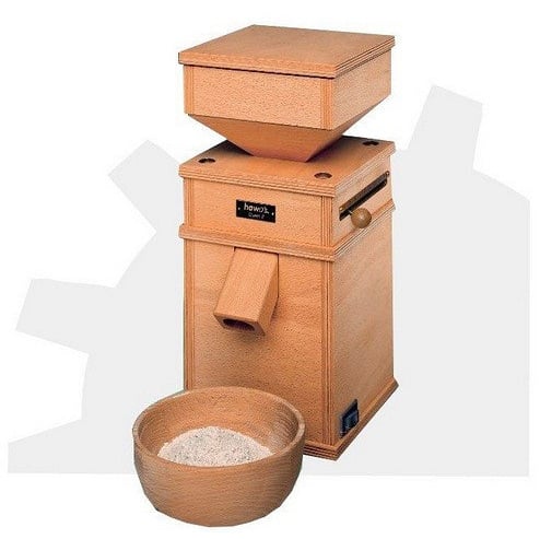 Hawos Queen 2 электрическая домашняя мельница для муки из зерновых бытовая для дома жерновая для зерна Корпус фанера из бука Обработан масло льна Вместимость бункера для зерна 1500 г Размеры В x Ш x Г 450 x 210 x 210 мм Высота отверстия выхода муки 17 см Вес 10,6 кг Мощность при помоле: Мелкий 220 г/мин Грубый 450 г/мин Жернова Корунд-керамика Диаметр 100 мм Мотор 230 Вольт - 600 Ватт 10 лет гарантии на все электрические мукомолки Hawos! Как и все наши мельницы Queen производится в двух вариантах: Queen 1 для средней потребности: 1- 4 персон и Queen 2 для большей потребности (бoльшая семья или поварские курсы). Внимание! Если Вам нужна мельница для производства свежесмолотой безглютеновой муки, просьба сообщить нам об этом при оформлении заказа! Хорошая кухня начинается с хороших компонентов. Безупречное происхождение продуктов и их свежесть всегда имеют спрос. Чем свежее, тем лучше. Это касается муки, круп и дерти- муки грубого помола. Злаковое зерно богато витаминами, минеральными веществами, протеинами, ненасыщенными кислотами. Бесконечно тонкие вкусовые нюансы придают каждому виду злаков свой определённый характер. Перемолотое зерно теряет со временем ценные витальные и ароматные вещества. Этот процесс начинается непосредственно после перемалывания. Тот, кто хочет полностью и по-настоящему насладиться результатом своего искусства приготовления, должен брать излюбленные зёрна и перемалывать их сам. Выпечка и свежесмолотой муки - это наслаждение. Всё это возможно с зерновыми мельницами от фирмы hawos. Попробуйте! Мелите и наслаждайтесь. Ваш Ральф Пигге. Директор фирмы hawos Фирма hawos является ведущим производителем электрических мельниц, применяемых в домашнем хозяйстве, а также, для общественного пользования, например в магазинах. Сердцем каждой мельницы hawos является сильный индустриальный мотор мощностью 360 W и даже мощнее (600 W) . Чрезвычайно большие жернова (перемалывающие даже маленькие камни) изготовлены из керамики и корунда. На хорошо обозримой шкале можно устанавливать степень помола. Результат измельчения наверняка будет соответствовать вашим желаниям. Благодаря ремесленной точности и развитой технике, каждая мельница фирмы hawos имеет 10 лет гарантии. Всё равно какую из них вы решитесь купить. Если вы будете иметь мельницу фирмы hawos,- то будете счастливы. Самой лучшей является мельница с каменными жерновами. Каменные жернова - проверены временем. Уже много столетий зерно превращается в муку между двумя камнями. При этом злаковые зёрна очищаются снаружи, а внутри щадяще перемалываются. Твёрдость и структура камней сказываются на результате перемалывания. Перемалывающие камни фирмы hawos были специально изготовлены из сплава керамики и корунда. Они чрезвычайно тверды, не чувствительны к инородным тельцам (например, к маленьким камушкам) и почти не изнашиваются. Благодаря точно спланированной обработке, камни фирмы hawos перемалывают зерно с невероятной точностью: согласно установке на шкале аппарата, - от грубого помола до мелкого. Все электрические мельницы фирмы hawos сделаны по одному принципу: Крышка, вместительный бункер для зерна. Корпус из дерева; внутри, по гигиеническим сображениям, камера помола изготовлена из пластмассы. Сильный индустриальный мотор с системой защиты от перегрева. Эластично располагаемая камера помола с чрезвычайно большими жернова
