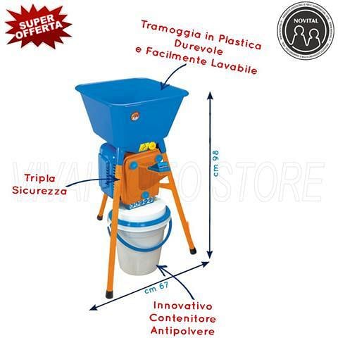 Борошномелька Novital Magnum 4V Для розмелювання зернових, бобових, спецій, цукру, кави, сухих трав, панірувальних сухарів. Італія Контейнер-відро у комплекті! Універсальний побутовий млин, дуже компактний і високопродуктивний. Завдяки роботі свого розмольного механізму дозволяє подрібнювати велику кількість різних сипких продуктів. Фракція млива регулюється, мінімальна тонкість 100 мікрон, максимальна 8 мм. В першу чергу використовується для швидкого розмелювання великих обсягів повного спектру хлібних злаків (кукурудза, жито, овес, ячмінь, пшениця), бобових, кави, спецій, цукру, також висушений хліб, сухі трави, сіно, солома і т.д. Обладнана пиленепроникною збіркою, яка з'єднує вихідний отвір розмольного механізму з нижнім бункером, до якого потрапляє готовий продукт. Вбудований автомат сприяє відключенню двигуна у разі перевантаження при тривалій роботі. Безпечний доступ до розмольного механізму. Оснащений спеціальною заслінкою для регулювання потоку надходження сипучих продуктів та зернових у розмольний механізм млина. Технічні характеристики: Ступінь подрібнення (мм) – від 0,1 до 8. Кількість ступенів помелу – 8. Потужність двигуна: 750 W, 13000 – 15000 об/хв. Напруга: 220 - 230 V. Продуктивність, кг/год: 90-250. - дрібна фракція 90 кг/година - велика фракція 250 кг/година. Вага: 12 кг. Матеріал корпусу: пластик. Розміри (см): 52 Х 44 Х 72 у комплекті 4шт сітки: Ø mm 4 Ø mm 2,5 Ø mm 6 Ø mm 8 додаткові сітки: 1,5 та 1 мм для борошна