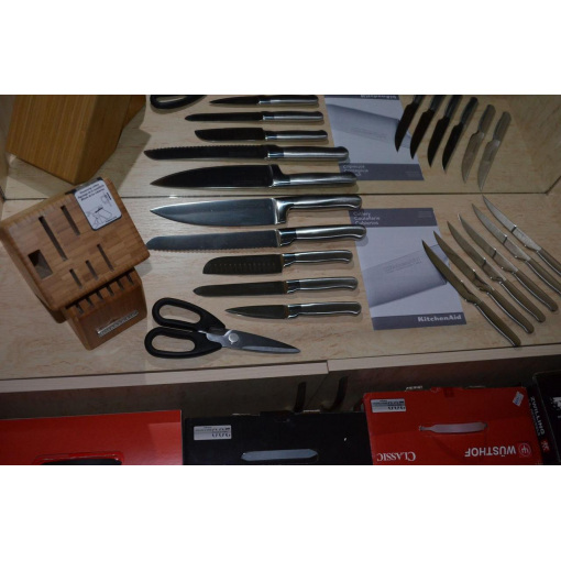 Набір ножів KitchenAid KKFSS14CS KitchenAid KKFSS14CS14 Piece Classic Forged Series Brushed Stainless Steel Cutlery Set Classic Forged 14-Piece Brushed Stainless Cutlery Set Набір кухонних ножів KitchenAid з дерев'яним блоком для зберігання і точилом. Склад: 1. Шеф ніж 197 мм (довжина леза) 2. Ніж для хліба 205 мм 3. Зубчастий універсальний ніж 137 мм 4. Сантоку 120 мм (універсальний японський ніж) 5. Ніж для овочів 93мм 6-11. 6 ножів для стейка 122 мм 12. Ножиці обробний. 13. Точило для ножів. 14. Дерев'яний блок для зберігання ножів. Ножі можна мити в посудомийній машині.