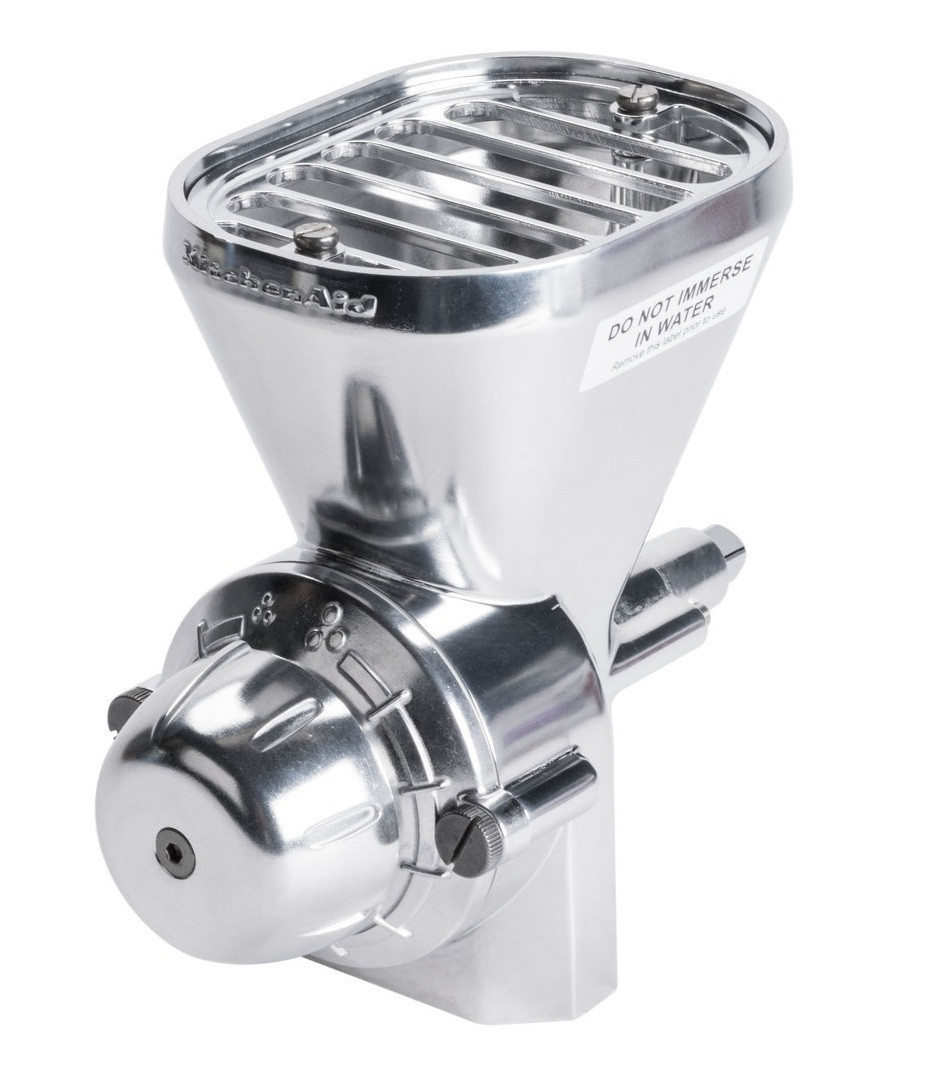 Насадка-мельниця KitchenAid — ця насадка перетворює міксер на абсолютно новий пристрій: млин, який мелює зерна пшениці, жита, риса, кукурудзи тощо., завдяки якому у вас вдома завжди буде борошно свіжого помелу для випікання поживного хліба, булочек и тортов. Також у цьому млині можна отримати незвичайне борошно з зерен і бобових культур, як, наприклад, борошно з нуту (турецького гороху). Млин можна налаштувати на різний ступінь помелу — від дрібного до грубозернистого.
