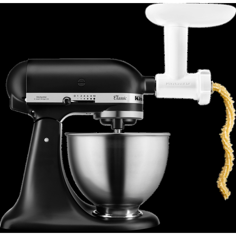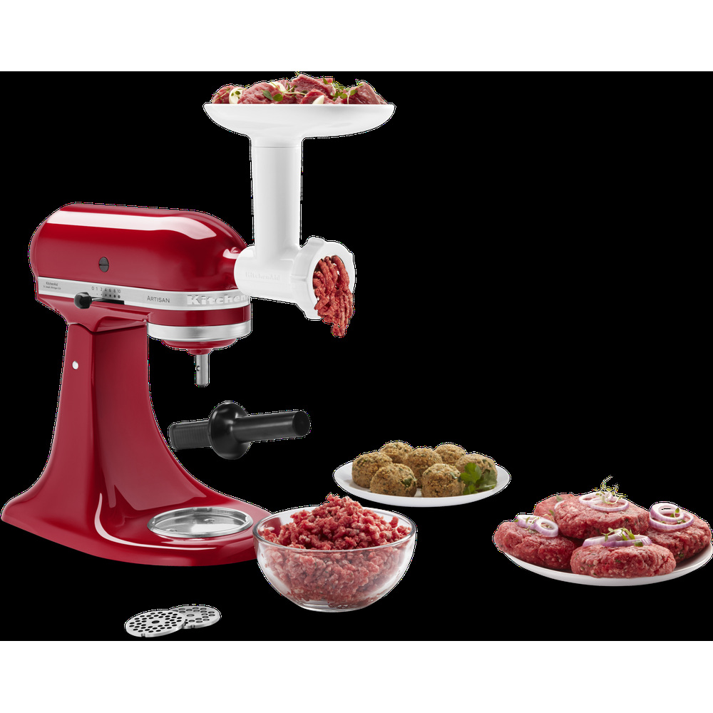 НАСАДКА-ІЗМЕЛЬЧОК (м'ясорубка) 5KSMFGA Найпопулярніша насадка-м'ясорубка KitchenAid для всіх наших планетарних міксерів стала ще надійнішою та простішою у використанні. Вона дає змогу швидко перемелювати, подрібнювати й натирати різні інгредієнти. За допомогою насадки-м'ясорубки KitchenAid ви зможете самостійно готувати поживні та смачні страви, наприклад фрикадельки, фалафель, сальсу та бургери. Для перемелювання та подрібнення інгредієнтів можна використовувати пластину з неіржавкої сталі для грубого подрібнення (6 мм) або для тонкого (4,5 мм). Крім використання як м'ясорубки, вона також ідеально підходить для подрібнення та тертки сухого хліба, овочів, фруктів, горіхів і сиру. До комплекту насадки-м'ясорубки KitchenAid також входять знімний піддон і зручний штовхач для продуктів, який дає змогу безпечно проштовхувати інгредієнти до пластин для подрібнення. Насадку можна мити в посудомийній машині. Чому б не проявити креативність і не використовувати цю насадку-м'ясорубку разом із протиркою для фруктів і овочів або насадкою для набиття ковбас KitchenAid для приготування ковбас, соусів або джемів? Насадка-м'ясорубка призначена для приготування м'ясного та рибного фаршу. Але двосторонній ніж із чотирма лезами підходить і для виконання інших завдань: перемелювання панірувальних сухарів або горіхів, приготування картопляного пюре або подрібнення компонентів під час приготування соусів зі шматочками м'яса або овочів. Можна встановити одну з двох насадок: для дрібного або великого подрібнення. Корпус м'ясорубки виготовлений із міцного пластику, стійкого до пошкоджень та фарбування. Пристрій зручно збирати та розбирати, оскільки в комплекті є спеціальний ключ для кільця, що утримує сітку. М'ясорубка також укомплектована штовхачем і піддоном для продуктів.
