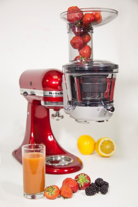 Компанія KitchenAid при всій своїй популярності не зупиняється на досягнутому рівні, а продовжує радувати своїх шанувальників новинками. Чергове корисний пристрій, представлене фірмою - насадка соковижималка, сумісна з усіма моделями планетарних міксерів. Вона розширює можливості приладу, роблячи його зручним і компактним кухонним комбайном. За допомогою насадки свіжі овочі, трави, фрукти перетворяться на свіжі корисні страви за кілька хвилин.