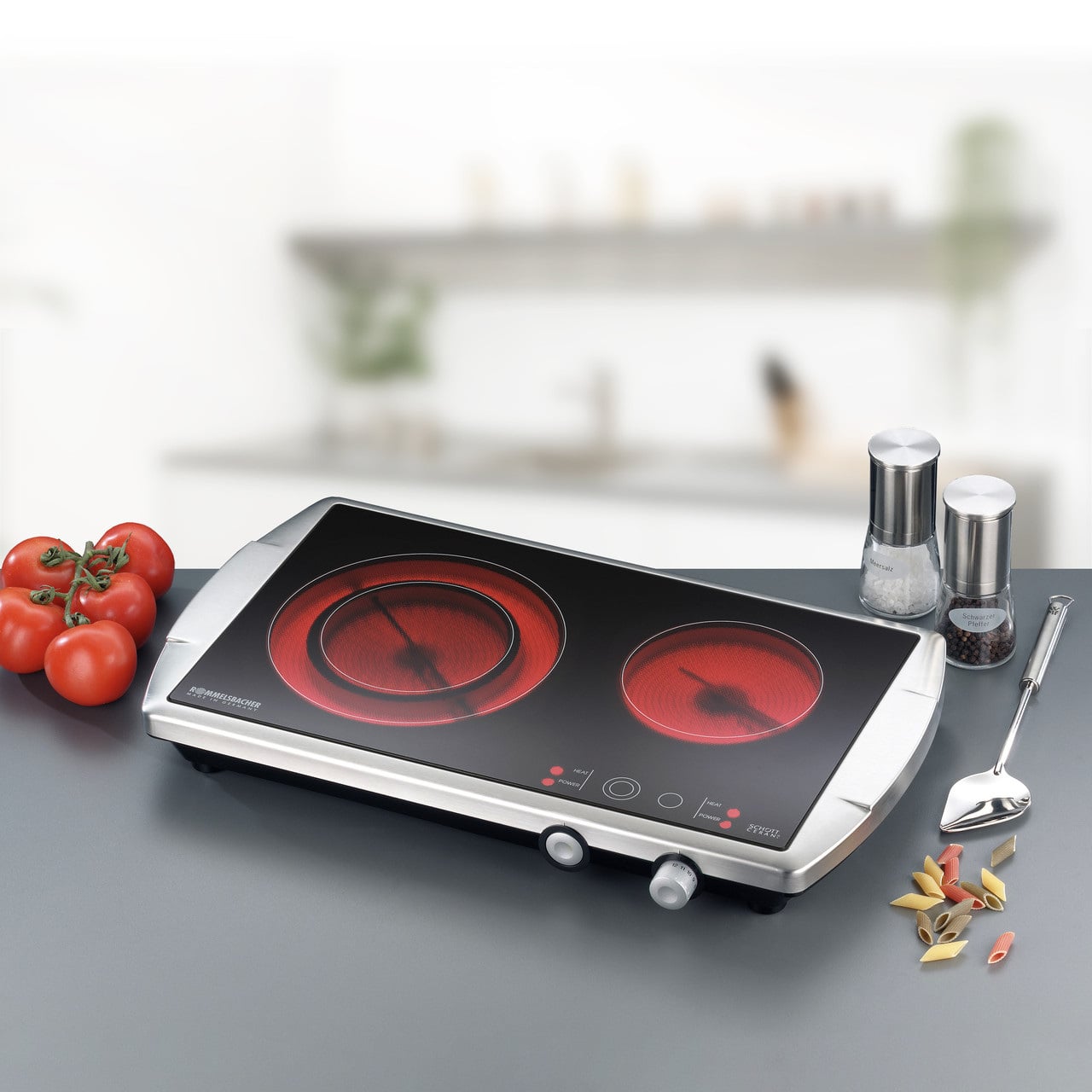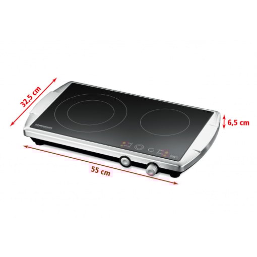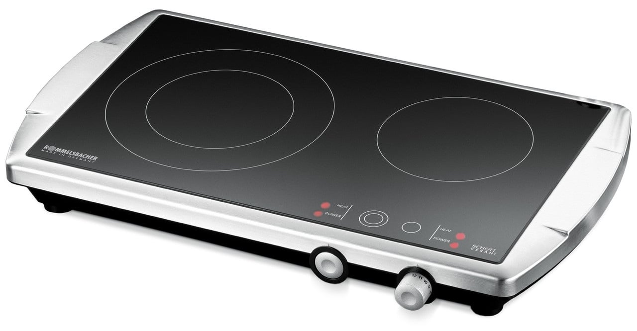 Плита Rommelsbacher CT 3400/E CERAN® Колір виробу: чорний/нержавіюча сталь Матеріал корпусу нержавіюча сталь Потужність 3400Вт Вага виробу 4,52 кг Розміри (Ш/Г/В) 55,00 х 32,50 х 6,50 см Тип варочної Інфрачервоний обігрівач HiLight® Schott CERAN® зони приготування 2: Конфорка 1 Ø 145 мм, 1200 Вт Конфорка 2 140/210 мм Ø, 1000/2200 Вт Особливості: короткий час нагріву, відмінна ефективність Виробник: Rommelsbacher корпус виконаний з матової нержавіючої сталі м'який дизайн варильна поверхня SCHOTT CERAN® – міцна склокераміка міцна HiLight® - нова енергоефективна технологія дуже швидке нагрівання перемикачі висуваються, що забезпечує захист від дітей потужність регулюється безступінчастими регуляторами індикатори залишкового тепла, світлові індикатори роботи : - Ø 140/210 мм, 1000/2200 Вт, - Ø 145 мм, 1200 Вт Плита подвійна HiLight Rommelsbacher CT 3400/E CERAN® виготовлена в Німеччині. Ця модель найвищої якості відповідає дуже високим вимогам і стандартам якості та безпеки. Плиту Rommelsbacher CT 3400/E ви можете використовувати у себе на кухні в будинку, можете встановити у зручному місці на дачі, а також її зручно використовувати в офісах та на кухні громадського харчування Дві конфорки (Ø 140/210 мм, 1000/2200 Вт + Ø 145 мм, 1200 Вт) розташовані на склокерамічній варильній поверхні SCHOTT CERAN®, і вбудована в корпус з матової нержавіючої сталі. Технологія сучасного часу HiLight® забезпечує швидке, якісне та енергозберігаюче нагрівання маленьких та великих зон нагріву. Безступінчасті регулятори висуваються, що забезпечує надійний захист від включення маленькою дитиною. Індикатор залишкового тепла та захист від перегріву теж відповідають за безпеку, що дозволяє використовувати плиту з максимальним комфортом.