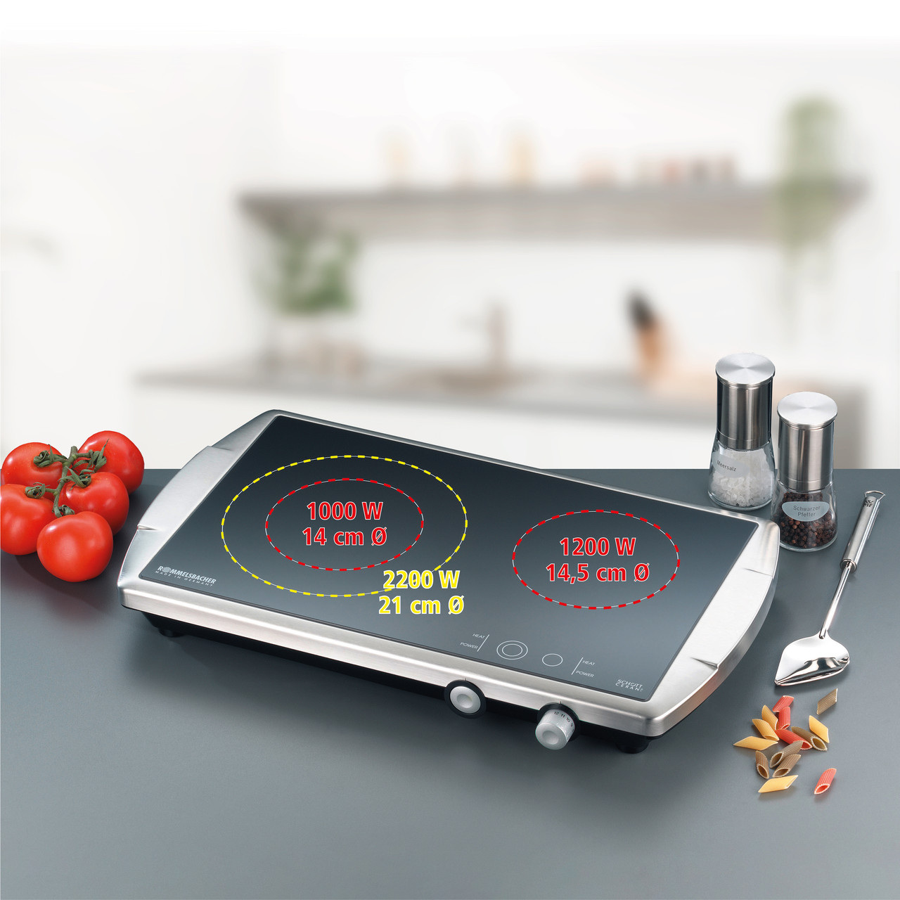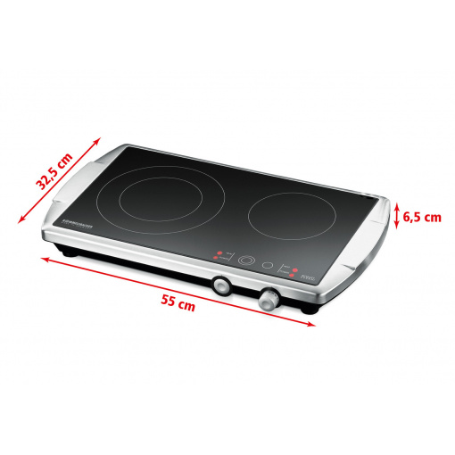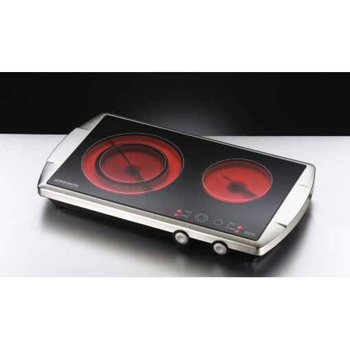 Дві конфорки (Ø 140/210 мм, 1000/2200 Вт + Ø 145 мм, 1200 Вт) розташовані на склокерамічній варочній поверхні SCHOTT CERAN® і вбудовані в корпус з матової нержавіючої сталі. Технологія сучасного часу HiLight® забезпечує швидкий, якісний і енергозберігаючий нагрів маленьких і великий зону нагріву.