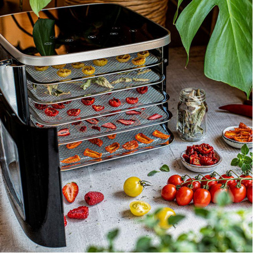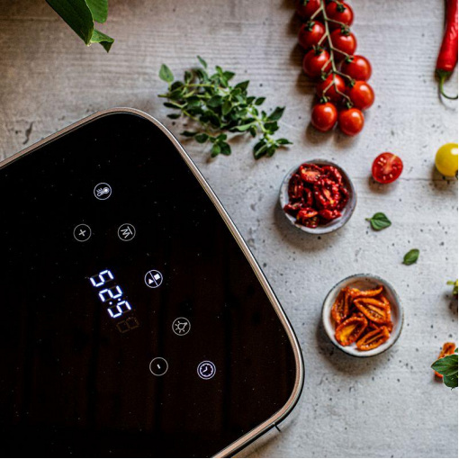 Професійний дегідратор Rommelsbacher DA 450 Професійний дегідратор Rommelsbacher DA 450 Колір: чорний / нержавіюча сталь Матеріал корпусу: Cool Touch, нержавіюча сталь Потужність: 420–500 Вт Вага: 6,40 кг Розміри (Ш/Г/В): 29,00 × 43,00 × 27,50 см Енергоспоживання в режимі очікування: ≤ 0,5 Вт Час переходу в режим очікування: 3 хвилини Кількість сушильних полиць: 5 (нержавіюча сталь) Загальна площа сушіння: близько 0,2 м² Діапазон температури: 35°C – 80°C Таймер: до 99 годин Керування: сенсорні датчики Touch Control, LCD-дисплей Підсвічування: LED, перемикане Функції: постійний контроль температури, підтримання тепла, можливість сушіння без нагріву (охолодження/розморожування) Фільтрація: змінний повітряний фільтр Догляд: всі змінні частини підходять для миття в посудомийній машині Комплектація: 5 нержавіючих лотків (23,5×18 см) 1 сітка для сушіння 1 піддон для пастили (BPA-free) 2 форми для мюслі-батончиків 5 змінних фільтрів Інструкція, гарантійний талон Виробник: Rommelsbacher (Німеччина) Гарантія: 24 міс (офіційна в Україні) Переваги Компактний корпус із технологією Cool Touch забезпечує безпечне використання та зручність розміщення навіть у невеликих кухнях. П’ять знімних лотків із нержавіючої сталі створюють велику площу сушіння та підходять для широкого спектра продуктів. Точний контроль температури від 35 °C до 80 °C дозволяє зберегти природний смак, структуру та корисні властивості продуктів. Енергоощадна та тиха робота забезпечує комфорт при щоденному використанні. Режим без підігріву підходить для охолодження або делікатного розморожування продуктів. 99-годинний таймер і функція підтримки тепла роблять сушіння повністю контрольованим і зручним. Внутрішнє LED-підсвічування дозволяє стежити за процесом без відкривання дверцят. Аксесуари можна мити в посудомийній машині, що значно спрощує догляд. Змінний фільтрувальний фліс забезпечує чистоту повітря та гігієнічність процесу. Розширена комплектація з килимком, решіткою та формами для мюслі робить пристрій універсальним для різних завдань. Опис Rommelsbacher DA 450 — це продуманий і ефективний дегідратор, який поєднує компактність, сучасні технології та високу продуктивність. Прилад створено для тих, хто цінує натуральну їжу та прагне відмовитися від промислових снеків. З площею сушіння близько 0,2 м² і п’ятьма лотками з нержавіючої сталі він чудово підходить для сушіння овочів, фруктів, ягід, зелені, грибів, м’яса, риби, пастили й інших продуктів. Оптимальний температурний діапазон 35–80 °C забезпечує ідеальний результат для різних видів продуктів, а рівномірна циркуляція повітря гарантує однакове висушування на всіх рівнях. Сенсорне управління з РК-дисплеєм робить роботу з приладом інтуїтивно зрозумілою, навіть для новачків. Додаткові функції — підтримка тепла, режим без підігріву, таймер до 99 годин, LED-підсвічування — дозволяють комфортно та точно контролювати процес сушіння. Усі аксесуари можна мити в посудомийній машині, що економить час і спрощує догляд. Rommelsbacher DA 450 — надійний вибір для тих, хто хоче отримувати здорові, натуральні снеки вдома, зберігаючи максимум користі та смаку.