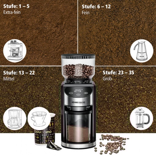 Кавомолка Rommelsbacher EKM 400 Кавомолка професійна Rommelsbacher EKM 400 Колір продукту чорний/нержавіюча сталь Матеріал корпусу нержавіюча сталь/пластик Потужність 200 Вт Вага предмета 1,90 кг Розміри (Ш/Г/В) 19,00 х 1 Місткість 220 г Ступінь помелу 35 рівнів Тип високоякісна конічна кавомолка Особливості Антистатична функція, світлодіодний дисплей, тримач портафільтра Виробник: Rommelsbacher Країна: Німеччина Гарантія: 24 міс Модульна кавомолка для кофемолки фе Широкий спектр налаштувань дозволяє дуже точно подрібнювати та дозувати каву: 35 ступенів помелу (дрібний-середній- грубий), до 12 порцій (1-2 порції для портафільтра), 10 ступенів об'єму порції Яскравий та чіткий світлодіодний дисплей відображає налаштування зроблені за допомогою сенсорів Кавовий контейнер для зерен об'ємом 220 грам має щільну кришку утримуючу запах Система автоматичного блокування Антистатичний контейнер для меленої кави знімний об'ємом на 130 грам Утримувач для портафільтра Нековзні ніжки, місце для шнура Високоякісна модульна, конічна кавомолка безсумнівно здивує вас результами. Кавомолка професійна Rommelsbacher EKM 400 надійно зберігає аромат свіжої кави та зерен, що використовуються при необхідності. За допомогою сенсорних кнопок і світлодіодного дисплея ви легко та швидко встановите розмір порції, також ви можете вибрати кількість порцій, можете відрегулювати потрібний ступінь подрібнення – їх 35 для еспресо, для меленої кави, для френч-пресу. З кавомолкою Rommelsbacher EKM 400 ви професійно, швидко та легко приготуєте мелену каву для подальшого використання у різних способах приготування улюбленої кави. Унікальна функція Rommelsbacher EKM 400 - це антистатична функція контейнера для меленої кави, вона нейтралізує статичний заряд готового порошку кави. Також є можливість подрібнювати потрібну порцію кави в портафільтр, для цього кавомолка оснащена знімним тримачем портафільтром. EKM 400 Rommelsbacher – це нове покоління кавомолок високого професійного рівня для використання любителями кави.