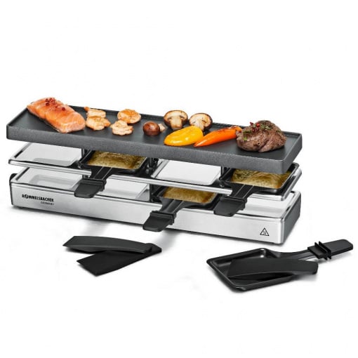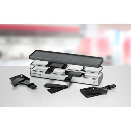 Раклітниця-гриль Rommelsbacher RC 800 Колір виробу сріблястий Матеріал корпусу: матовий алюміній, лиття під тиском Потужність 730 Вт. Вага виробу 2,75 кг Розміри (Ш/Г/В) 43,50 x 10,20 x 13,50 см Площа гриля 41 x 10 см Матеріал решітки Пластина решітки з литого під тиском алюмінію Антипригарне покриття 2 шари антипригарного покриття Кількість сковорідок: 4 сковороди з антипригарним покриттям та термоізольованими ручками Спеціальні функції з можливістю розширення до 12 сковорідок - практичний майданчик для паркування гарячих та невикористаних сковорідок. Виробник: Rommelsbacher Країна: Німеччина, вироблено: Китай Гарантія: 24 міс (офіційна в Україні) Весела вечірка у гарній компанії - з 4 сковороди, з можливістю розширення до 8 або до 12 сковорідок. Ексклюзивний корпус з матового литого під тиском алюмінію масивна знімна решітка з литого алюмінію, 41 x 10 см Підставка для гриля з високоякісним двошаровим антипригарним покриттям Xylan® Plus для досягнення найкращих результатів і надзвичайно простого очищення контрольна лампа, захист від перегріву подовжений знімний кабель XXL (2 м) У комплекті: 4 високоякісні сковорідки з антипригарним покриттям та термоізольованими ручками, 4 двосторонні скребки, 1 кабель живлення, 1 з'єднувальний кабель. Елегантний дизайн – першокласне обладнання – справжнє задоволення. Добре продумані деталі – сковороди можна використовувати всюди. Елегантна серія raclette & grill, яку можна вільно комбінувати за столом та яка не залишає бажати нічого кращого. Якісні матеріали та найкраща обробка роблять ці пристрої справжніми зірками вечірок. Стійкий корпус з литого під тиском алюмінію забезпечує надійну стійку, а масивна решітка забезпечує найкращий розподіл тепла з плавним регулюванням температури за необхідності. М'ясо та ковбаси, а також риба та овочі ідеально підходять для гриля; У той же час у 4 деках на пристрій можна приготувати різні закуски та плавити сир раклет. Під час перерв на їжу сковороди надійно і компактно припарковуються на вбудованому паркуванні. Високоякісне антипригарне покриття пластини для гриля та сковорідок робить приготування на грилі особливо приємним та легко очищається після цього. Особливо варто відзначити, що до трьох окремих пристроїв із цієї серії можуть бути підключені та об'єднані один з одним за допомогою кабелів. Це дозволяє отримати максимум задоволення від приготування раклету та грилю з 12 сковорідками навіть для великого круглого столу!