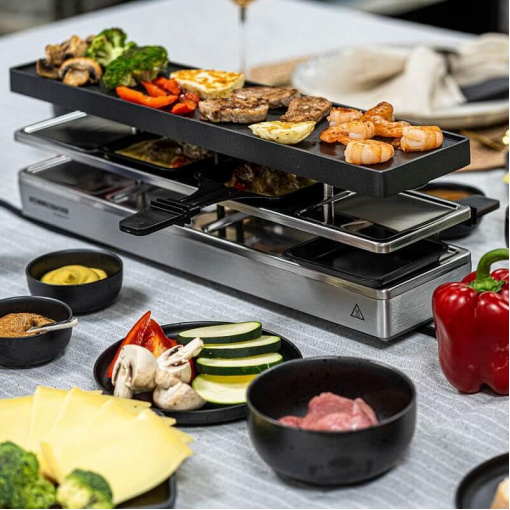 Раклетниця-гриль Rommelsbacer RC 1600 Раклетниця Rommelsbacher RC 1600 – елегантне поєднання гриля та традиційного раклета для компанії до 12 осіб Технічні характеристики: Модель: Rommelsbacher RC 1600 Колір: сріблястий Матеріал корпусу: литий алюміній Матеріал гриля: тверда лита алюмінієва пластина Потужність: 2 × 730 Вт Поверхня гриля: 41 × 10 см Антипригарне покриття: двошарове Xylan® Plus Кількість сковорідок: 8 (можливе розширення до 12) Розміри пристрою: 43,5 × 20,4 × 13,5 см Вага: 4,78 кг Живлення: 230 В Особливості: інтегрований рівень зберігання для гарячих сковорідок, можливість об’єднання до трьох приладів Довжина шнура живлення: 2,0 м Виробник: Країна бренду: Німеччина, Країна виробництва: Китай Гарантія: 24міс (офіційна в Україні) Переваги: Розкішна раклета-система для 8 осіб з можливістю розширення до 12 сковорідок Ексклюзивний корпус із литого алюмінію – міцний, стійкий до перегріву й стильний Тверда алюмінієва поверхня гриля з чудовим антипригарним покриттям Xylan® Plus Плавне регулювання температури для точного контролю процесу Розумний рівень зберігання для гарячих сковорідок, які не використовуються Дві окремі гриль-пластини по 41×10 см для одночасного приготування різних страв Знімні кабелі живлення (2 шт.) і з’єднувальний шнур у комплекті Просте очищення після використання Раклетниця Rommelsbacher RC 1600 — це універсальний прилад для дружніх зустрічей, вечерь або святкових застіль. Вона поєднує функції гриля й традиційного раклета, створюючи атмосферу спільного приготування та задоволення за столом. Дві незалежні гриль-зони з антипригарним покриттям Xylan® Plus гарантують чудовий результат приготування м’яса, риби, овочів чи морепродуктів. А в маленьких сковорідках можна плавити сир, готувати закуски або десерти. Модель Rommelsbacher RC 1600 легко масштабується: можна з’єднати до трьох приладів в одну систему, розширивши кількість сковорідок до 12 — ідеально для великих компаній. Розумний рівень зберігання дозволяє безпечно тримати гарячі сковорідки під час перерви в приготуванні. Високоякісні матеріали, елегантний дизайн і ретельно продумана конструкція роблять цей прилад не лише функціональним, а й естетичним доповненням вашої кухні. Rommelsbacher RC 1600 — це стиль, комфорт і кулінарне задоволення для кожного вечора.