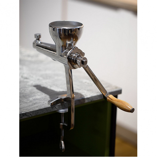 Легко встановлюється на стіл або стільницю за допомогою гвинтового затискача, не дряпає чутливих поверхонь завдяки гумовим накладкам у комплекті, легко і без зусиль управляється завдяки довгому сталевому кривошипу з дерев'яною ручкою ергономічної форми.