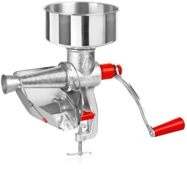 Соковитискач ручний для томатів TRE SPADE (I/I) Tomato squeezer TRE SPADE Spremipomodoro TRE SPADE Класичний ручний соковитискач для томатів TRE SPADE Розмір № 3 Лужений чавунний корпус Шнек Ø 1,5 мм Бункер та колектор з нержавіючої сталі Вага: 4,0 кг Ручна томаточискача ITRE SPADE (I/I), оригінальна модель Tre Spade (MADE IN ITALY!), функціональна та практична, гарантує швидшу роботу та високу годинну продуктивність томатний соус. Томатовитискач виготовлений в Італії і має такі конструктивні особливості, які роблять його міцним і довговічним, як: - луджена чавунна конструкція; - металева ручка з рукояткою з ABS; - регульований маховик для затиску столу з подвійним підшипником, виготовленим з тефлону та ABS для захисту столу від можливих подряпин; - великий бункер та жолоб з нержавіючої сталі, які легко очищаються; - шнек та фільтр є знімними, що забезпечує ретельне та легке очищення машини. ТЕХНІЧНІ ХАРАКТЕРИСТИКИ: - Типорозмір № 3 - Корпус із лудженого чавуну - Шнек з харчового нейлону - Бункер та жолоб з нержавіючої сталі - Підтримує, за запитом, пристосування для віджиму ягід (пристосування набувається окремо, код 10040) - Маса.