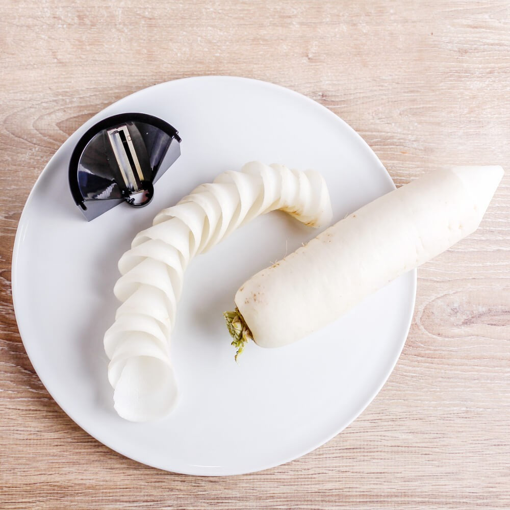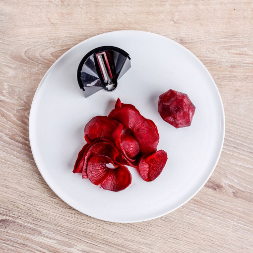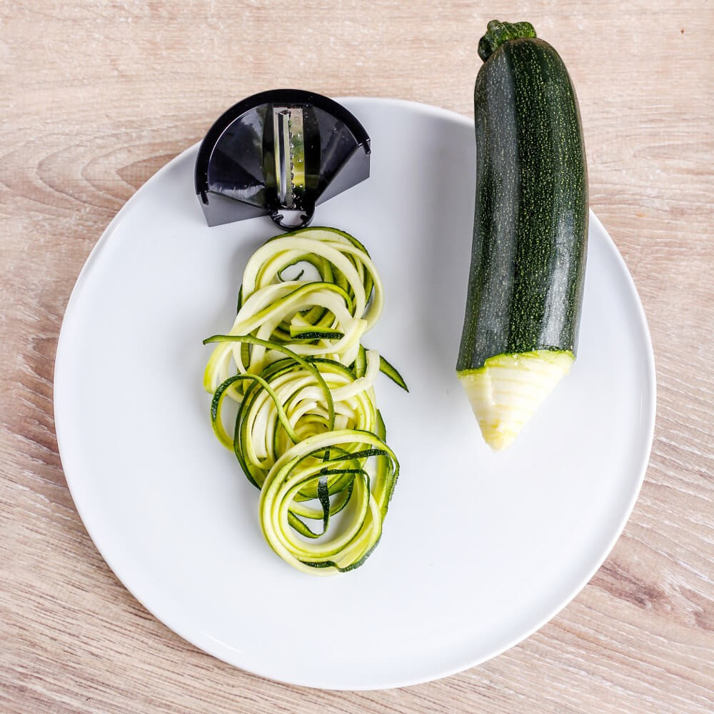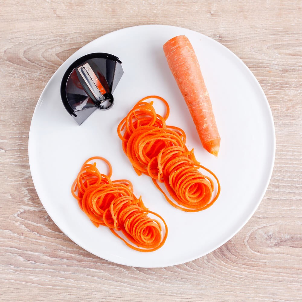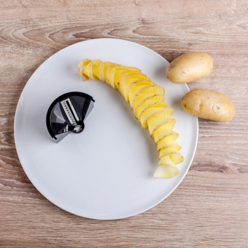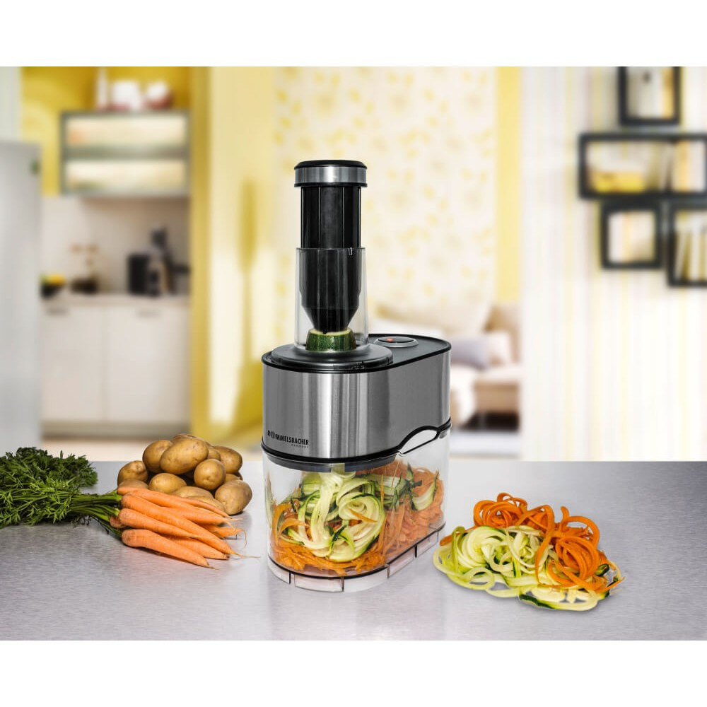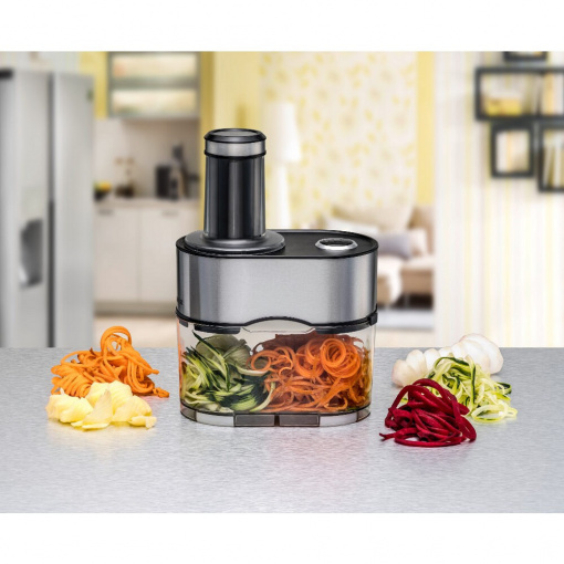 П'ять змінних ріжучих пластин ріжуть «овочеву локшину» різних форм (тальятелле, лінгвіні, спагеті), що дозволяє комбінувати корисні макарони й овочі. Тонкі спіральки з редису для закуски в баварському стилі також легко приготувати, як і популярні спіралі з картоплі для смаження у фритюрі. Завдяки дуже великим збірного контейнеру з пластику, не містить бісфенолу А, можна швидко і надійно обробляти навіть великі кількості.