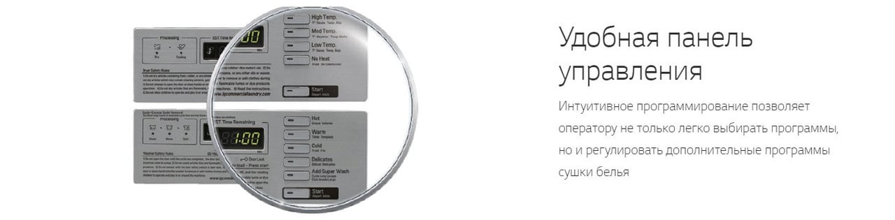 Сушильная машина 10-15 кг. LG RV1329CD4PКоммерческая сушильная машина LG RV1329CD4P 15 кг Профессиональные сушильные машины LGС гордостью представляем одни из немногих новинок на рынке профессиональной техники для стирки: стиральную и сушильную машины серии LG Commercial Laundry Systems (Корея)Эти машины для коммерческого использования, созданные первоначально для американского рынка прачечных, заслуженно заняли свое место и в смежных рынках. Они успешно используются во всем мире в ресторанах, саунах, кафе, гостиницах, отелях, коттеджах, спортклубах, салонах красоты, детских садах, интернатах, предприятиях общепита. Отличительными особенностями оборудования LG от аналогичной продукции, представленной в данном сегменте рынка Украины, является: · лёгкость при работе, не требующая специализированных знаний (программы уже заданы и запрограммированы на заводе-производителе под все типы белья). · удобный запуск и монтаж (благодаря облегчённым, компактным габаритам и массе изделия легко устанавливается в любом месте аналогично бытовой стиральной машине) · минимальные требования по коммуникациям, которые позволяют размещать оборудование на любых объектах и в т.ч. бытовых помещениях (благодаря системе электропитания 220V/1F) · Линейка, созданная на основе опыта предыдущих поколений Сушильна машина 10-15 кг. LG RV1329CD4PБАРАБАНОбъем, лДиаметр, ммГлубина, мм207663570.6ГАБАРИТЫРазмеры (ШхВхГ), ммС упаковкой (ШхВхГ), ммВес (нетто/в упаковке), кг686 x 983 x 764760 x 1,170 x 79559 / 65ПИТАНИЕВ/Гц/А120(240)/60/26ПОТРЕБЛЕНИЕЭлектричество, Вт5,400СИСТЕМА И КОНТРОЛЬТип нагреваТип сушкиРасход воздуха куб м/мин Мощность двигателя кВт Мощность нагрева ВтДлительность циклаЭлектрическийВентиляционный4.530.4(120V)0.3(220~240V/50Hz)0.4(220V)120V/220V 5,40050 минСОЕДИНЕНИЯТруба подачи воздуха ммТруба отвода воздуха мм100100ПРОГРАММЫ Список программ ВысокаяСредняяНизкаяБез нагреваВНЕШНЯЯ ОТДЕЛКАБарабанAlcosta