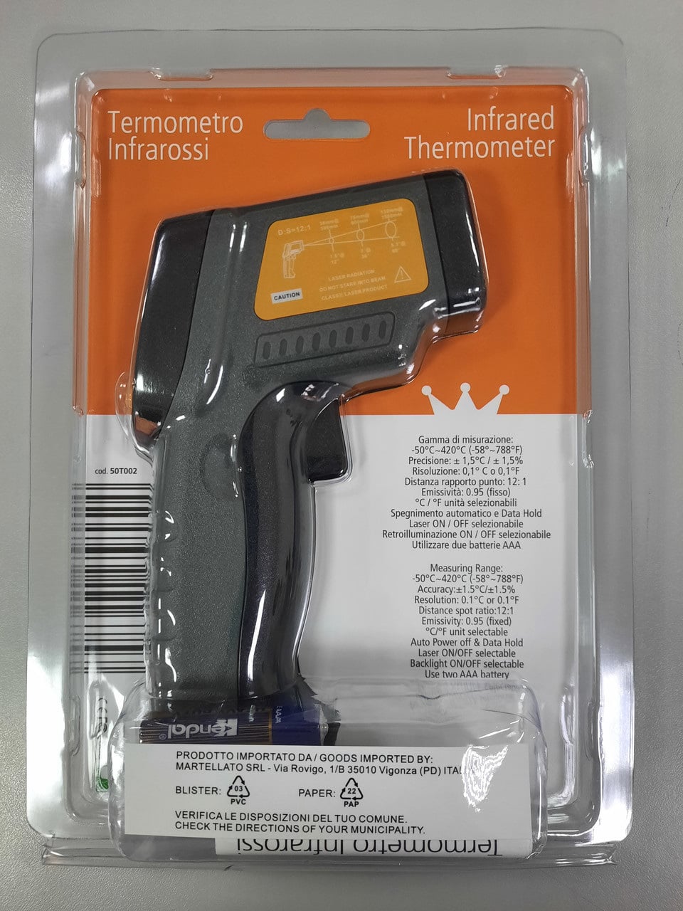 Термометр інфрачервоний безконтактний Martellato 50T002 для вимірювання температури шоколаду Виробник: Martellato (Італія) Температурний діапазон: від -50 ° C до +420 Компактний, безконтактний термометр (пірометр) від італійської компанії Martellato. Призначений для визначення температури шоколаду та іншої продукції, оснащений дисплеєм із підсвічуванням. За допомогою даного пірометра ви легко і швидко вимірюєте температуру шоколаду в процесі приготування, він також підходить і для вимірювання температури будь-яких інших харчових виробів і не тільки.