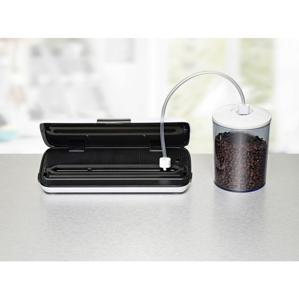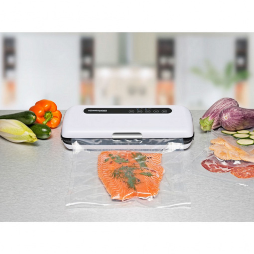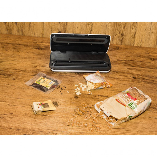 Вакуумний пакувальник Rommelsbacher VAC 110 VACUUM SEALER VAC 110 Колір білий з чорним Потужність 230 В 110 Вт Вага 1,31 кг Розміри 36,00 х 15,5 х 7,50 см Продуктивність насоса 9 л / хв Підключення шланга Ширина плівки до 30 см шириною Особливі можливості індивідуальне всмоктування і ручне запечатування продуктів, чутливих до тиску EAN 4001797820105 Виробник: Rommelsbacher Країна: Німеччина Гарантія: 24 міс Швидке всмоктування - відмінна продуктивність, кращі функції і незвичайний дизайн корпус з високоякісного матеріалу, що не вимагає особливого догляду чудовий, високопродуктивний поршневий насос, макс. продуктивність 9 л / хв повністю автоматичне всмоктування і запечатування за один робочий етап міцний шов герметизуючий індивідуальне всмоктування і ручне запечатування продуктів, чутливих до тиску 2 швидкості насоса, 2 варіанти запечатування підходить для фольги і пакетів шириною до 30 см, а також для вакуумування контейнерів порт для шлангу для вакуумування у контейнерах управління за допомогою сенсорних клавіш контрольні індикатори безпечна підставка, компактне зберігання Комплектація: 5 поліетиленових пакетів, рулон пакетів, вакуумний шланг Зберігає свіжість продуктів в 5 разів довше. Компактний і потужний! Цей зручний і привабливий вакуумний пакувальник всмоктує до 97% повітря із спеціальних вакуумних пакетів. Згодом він повністю автоматично запечатує їх міцним швом всього за один крок. Завдяки 2 налаштувань часу запечатування відповідно 2 швидкості насоса, ви можете налаштувати процедуру індивідуально для продуктів, які будуть зберігатися. Для продуктів, особливо чутливих до тиску, передбачений спеціальний режим ручної запаювання. Більше того, режим «запечатування контейнерів» дозволяє навіть вакуумно запечатувати чутливі і рідкі продукти в спеціальних контейнерах, щоб вони залишалися свіжими протягом тривалого часу. Сенсорні клавіші і гладка поверхня, не потребують особливого догляду, гарантують зручність використання та легке очищення. Вакуумна герметизація зберігає продукти свіжими в 3-5 разів довше - Ось чому цей корисний прилад повинен бути в кожному домі!